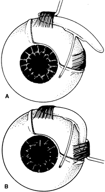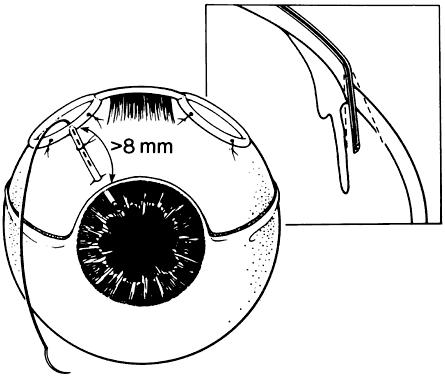 ANESTHESIA The operation may be lengthy but virtually all adult patients can be managed safely and comfortably with local anesthesia. The local anesthesia may be supplemented by subconjunctival infiltration with local anesthetic, which in turn is helpful in separating scarred subconjunctival tissue from the sclera. If the intraocular pressure is high (more than 35 mmHg), intravenous mannitol should be given (1 to 2 g/kg) over 30 to 45 minutes whenever medically acceptable. If the intraocular pressure is lowered, the magnitude of the reduction of intraocular pressure with surgery is not as dramatic and the risk of suprachoroidal hemorrhage or massive choroidal effusion may be reduced. EXPOSURE OF THE SCLERAL BED The conjunctival flap is raised by sharp dissection from the insertion at the limbus. The fornix-based flap is elevated, which allows direct visualization for further subconjunctival dissection to bare sclera. Alternatively, a conjunctival incision is made 4 to 6 mm from the limbus to raise a limbal-based conjunctival flap. This is helpful when there is a previous limbal filtration site, which is best avoided. If the old site is inadvertently reopened, the globe becomes hypotonus and it will be difficult to place the shunt reservoir. The superotemporal and superonasal quadrants are exposed with Westcott or curved Stevens scissors. The superior rectus muscle is located with a strabismus hook. The hook is passed from the superotemporal direction to avoid incorporating the superior oblique muscle. A 4-0 silk suture may be passed underneath the superior rectus tendon. Use of an anterior metabolite such as 5-fluorouracil or mitomycin C with tube shunt reservoirs remains controversial. Although it was demonstrated in an animal study that the blebs overlying the reservoir are thinner and contain less connective tissue,61 the clinical use of antimetabolites has not been shown to have any great benefit.62 PLACEMENT OF THE TWO MOLTENO PLATES The Molteno plate with the interconnecting tube slides into the superonasal quadrant (Fig. 4). A curved Hartman hemostat is passed underneath the superior rectus muscle in the temporal to nasal direction. The plate is grasped and pulled underneath the rectus muscle; this tight squeeze may traumatize the extraocular muscles. Placement of the interconnecting tube over the superior rectus muscle usually is sufficient and avoids the difficulty of passing a reservoir under the superior rectus insertion. Posterior to the insertion of the rectus muscles, a partial-thickness scleral pass is made with 6-0 Mersilene suture* on a spatula needle in both quadrants to anchor the plates. The plates are secured by tying one or two 6-0 Mersilene sutures that are passed through the plate anterior positioning holes. The anterior edge of the plates should be no closer than 8 mm from the limbus. Ethicon, Inc, Somerville, NJ. ADJUSTING TUBE FLOW A 4-0 nylon suture is inserted into the distal end of the tube (Fig. 5). A 6-0 polyglactin (Vicryl*) suture is tied externally around the tube. Balanced salt solution is injected through the proximal end of the tube to ensure that fluid passage through the tube meets resistance but is not totally occluded. This approach allows the tube to be partially functional for the first few days and weeks and eliminates the need for an adjunctive trabeculectomy-filtering site for temporary intraocular pressure control, as in situations when the tube is totally occluded. It also ensures that profound hypotony is avoided, as typically occurs if the tube is not partially occluded. The other end of the suture—with the needle—is passed through the subconjunctival space into the inferonasal aspect, where it is externalized. The exposed excess suture and needles are then cut off (Fig. 6). An alternative approach is to totally occlude flow with the external ligature. Venting foots are made in the tube proximal to the external ligature. These vents are created with a sharp microblade and allow fluid flow at high intraocular pressures until the external ligature dissolves or is cut. Ethicon, Inc., Somerville, NJ TUBE PLACEMENT IN THE ANTERIOR CHAMBER The tube is shortened obliquely with a Vannas scissor, so that about 2 mm is in the anterior chamber, with the tube bevel facing anteriorly (Fig. 7). A sharp bevel makes entry through a tight sclerostomy easier. Additionally, the tube opening is less likely to be occluded by fibrin, blood, or ocular tissue. A 23-gauge needle is passed through the limbus, creating a 1- to 2-mm intrascleral tunnel before entry. The external opening is enlarged slightly with the needle to allow easier tube entry. The needle is passed in a direction to keep the tube pointed away from the cornea but not touching the iris or lens. Occasionally, viscoclastic injection is helpful to keep the anterior chamber deep before the tube entry. If the tube insertion is difficult, the 4-0 intraluminal nylon suture can be used as a stent. The tube tip with the suture is kept more rigid and it allows easier entry into the anterior chamber. Alternatively, if a total vitrectomy has been performed, the tube can be placed through the pars plana into the vitreous cavity. PATCH GRAFT Using only a conjunctival closure over the tube may result in conjunctival erosion and tube exposure, with a definite risk for endophthalmitis (Fig. 8). A limbal-based or rotational scleral flap tied over the tube may vault the intraocular portion of the tube anteriorly against the cornea. It is simpler to use donor tissue to cover the tube. The donor tissue may be sclera, fascia lata, cornea, or pericardium. The pericardium is commercially prepared and packaged. The other tissues may be obtained through regional eye banks. Less available but potentially acceptable tissue is amniotic membrane or dura. After the patch is trimmed and thinned to the desired specifications, four 10-0 nylon sutures anchor the patch graft over the tube. Care should be taken to cover the an