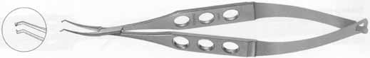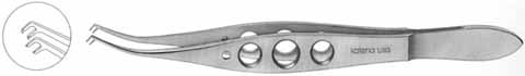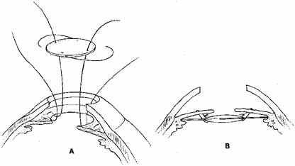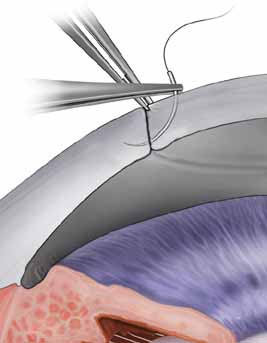 The host tissue is set aside and, upon completion of the procedure, will be sent to pathology for histologic examination and special staining as warranted by the indication for corneal grafting. Until the donor tissue is securely sutured into place, however, the original host tissue should be available, in case it is needed to close the eye. Also, a temporary keratoprosthesis, such as the Cobo keratoprosthesis, should be available to help maintain the integrity of the globe. At this point of the procedure (i.e., when the host cornea is being removed and the globe pressure is equal to atmospheric pressure), the risk of suprachoroidal hemorrhage is greatest. This potentially devastating complication is caused by the rupture of a choroidal vessel, which results in rapid and uncontrolled bleeding in the suprachoroidal space. The hemorrhage may force the iris, lens, vitreous, retina, and other intraocular contents to prolapse out through the corneal trephination wound. Risk factors for surprachoroidal hemorrhage include previous intraocular surgery, elevated IOP, myopia, advanced age, and arteriosclerotic disease. Patients with large body habitus may be prone to increased intrathoracic pressure and may generate additional posterior pressure. These patients may be best approached with general anesthesia. Intraoperative risk factors include rapid decompression of IOP upon entry into the anterior chamber, Valsalva maneuver performed by the patient at the time of trephination, or compression and occlusion of the endotracheal tube resulting in a mechanical Valsalva maneuver. Management of a suprachoroidal hemorrhage is based on when it occurs during the procedure.13 Rapid recognition and response afford the best chance of salvaging the eye. If the hemorrhage occurs upon initial entry into the anterior chamber, the host cornea is sutured back into place, using 8-0 silk or 9-0 nylon sutures, which not only are easier to visualize and tie in rapid sequence, but also have greater tensile strength than 10-0 nylon sutures. Drainage of the hemorrhage can be accomplished by entering into the choroidal space by making a sclerotomy. If the hemorrhage occurs after the host cornea has been removed, the temporary keratoprosthesis is quickly placed into the wound to compress the hemorrhage and to keep intraocular contents in their correct anatomic positions. Our routine during host tissue removal is to have the assistant hold the temporary keratoprosthesis for rapid placement, and the assistant only returns it to the instrument table when all four cardinal sutures have been placed and tied. In the absence of a temporary keratoprosthesis, a surgeon may use his or her finger to tamponade the hemorrhage. Pressure is maintained until the hemorrhage stabilizes. Sclerotomy can be performed to drain the surprachoroidal hemorrhage, and then the donor or host tissue is sutured into place. Alternatively, sclerotomy and drainage of the suprachoroidal hemorrhage can be done at a later date if the intraocular contents can be successfully reposited at the the time of surgery. If possible, irrigating fluid can be placed into the anterior chamber via keratoprosthesis attachment or anterior chamber maintenance port. This fluid can help deepen the anterior chamber, resulting in more anatomic orientation of intraocular contents and may also facilitate evacuation of the hemorrhage. Upon successful entry into the anterior chamber and removal of the host tissue, the donor tissue can then be secured to the patient. We will describe standard phakic keratoplasty and will then discuss specific situations, such as combined keratoplasty and cataract removal and also keratoplasty in the pseudophakic patient. Up to this point in the description of the procedure, the steps taken for combined procedures are similar to those in standard phakic keratoplasty. Simple Penetrating Keratoplasty In a simple PK, such as in patients with keratoconus, the donor cornea is transferred from the Teflon block to the surface of the eye using a Paton spatula. This transfer is done immediately adjacent to the patient's eye in the operating field to minimize the likelihood of inadvertent tissue loss onto a nonsterile field. The surgeon's dominant hand is used to lift the donor graft. Viscoelastic substance is placed on both the endothelial side of the donor button and on the host corneal tissue rim. The donor tissue is brought to the host rim, and it is tipped slightly by touching the cut edge of the graft to the 6 o'clock position on the viscoelastic-coated host rim. The tissue is tipped by rotating the wrist and the Paton spatula so that the graft is positioned almost perpendicularly to the host cornea. This position facilitates a precise grasping of the top edge of the donor tissue by split-tined Hofmann-Polack forceps (Fig. 5). These speciallydesigned forceps allow for the uninterrupted passage of a needle between the two toothed tines. After the elevated edge of the graft is grasped by the Hofmann-Polack forceps, the surgeon quickly exchanges the Paton spatula for a preloaded needle driver containing a 10-0 nylon suture. The suture is first placed onto the donor cornea at the 12 o'clock position. The action of suture placement involves not only the passage of the needle onto the graft tissue, but also the placement of the graft tissue onto the needle. In this sense, one can think of “placing the graft onto the needle” in addition to passing the needle through the graft. The optimal exit depth of the suture is approximately 90% thickness, with the exit path extending radially through the stromal side cut of the donor graft tissue (Fig. 6). The donor tissue is released by the Hofmann-Polack forceps, and then the host rim is grasped.