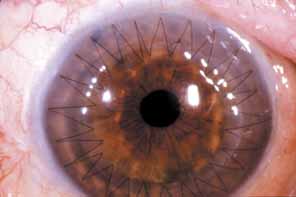 After irrigating the recipient bed with balanced saline solution and making sure that the recipient bed is visibly free of debris, the donor cornea is placed stromal side down in the recipient bed, making certain that it is well-centered and without any folds. Four cardinal 10-0 nylon sutures are then placed at the 12 o'clock, 6 o'clock, 3 o'clock, and then 9 o'clock positions. These are tied in a slipknot fashion and, after ensuring equal and appropriate tension, tied down permanently and rotated to bury the knots. The use of qualitative intraoperative keratometry may be used to ensure adequate tension. Four or 12 additional 10-0 nylon sutures are then placed. Tension is again assessed, and then the sutures are tied and rotated. Some surgeons routinely place a running 10-0 nylon suture in addition to the interrupted sutures, although this is generally not required. A bandage soft contact lens is applied to the eye and a drop of ciprofloxacin (or other broad spectrum antibiotic) and a drop of prednisolone acetate 1% are placed in the eye. Bacitracin or erythromycin ointment is then applied, and the eye is then patched and shielded until the first postoperative visit. POSTOPERATIVE MANAGEMENT Patients are seen on postoperative day 1, at which time the patch is removed. Visual acuity assessment, IOP measurement, and slit-lamp examination are performed. The patient is usually started on topical corticosteroids (e.g., prednisolone acetate 1%) four times daily, topical antibiotic drops (e.g., fluoroquinolone) four times daily, and topical antibiotic ointment at bedtime (e.g., erythromycin or bacitracin). If there is significant graft edema, the frequency of corticosteroid use can be increased accordingly. Patients are routinely seen on postoperative day 1, postoperative day 7, and once between postoperative days 21 through 28. Subsequent visits are then spaced out over longer time intervals and vary on a case-by-case basis. At all postoperative visits, particular attention should be paid to suture integrity, status of the graft, and IOP. If increased IOP results (which is much less common in lamellar than in penetrating keratoplasty), topical pressure-lowering drops or systemic agents should be administered to prevent rejection, to clear corneal edema, and to prevent damage to the optic nerve. Topical carbonic anhydrase inhibitors are relatively contraindicated in both LK and PK because they may compromise the corneal endothelium. Sutures in the steep axis are selectively cut based on corneal topographic map readings to reduce postoperative astigmatism starting at 3 to 4 months postoperatively. All sutures may be removed by 6 to 9 months after the procedure. A drop of topical antibiotic (e.g., fluoroquinolone) should be instilled in the eye immediately after a suture is cut and then used four times daily for 7 days. In lamellar keratoplasty, topical corticosteroids are generally tapered over 2 to 3 weeks after the surgery. If there are signs of graft rejection, the frequency of topical corticosteroid use should be increased to every 1 to 2 hours while awake with frequent follow-up. Signs or symptoms of graft rejection or failure may include decreased vision, photophobia, foreign body sensation, conjunctival injection, epithelial defects or bullae, stromal edema, and neovascularization. Pachymetry is a useful tool to objectively monitor changes in the amount of graft edema, if present. Major complications are relatively rare, given the extraocular nature of the procedure. The most common complication incurred in LK is delayed epithelialization of the donor surface, which may result from damage to limbal stem cells or from prolonged surgery with exposure of the ocular surface. Persistent epithelial defects may be a stimulus for corneal neovascularization and melting. Corneal perforation intraoperatively is one of the most important complications because the risks of all intraocular procedures then become applicable. If Descemet's membrane is violated at the time of trephination, the keratotomy incision should be immediately closed and the procedure delayed for several weeks to allow healing of the disrupted Descemet's membrane. Other complications include allograft rejection, sterile corneal melting, microbial keratitis, epithelial downgrowth, recurrence of pathology, failure to improve vision or even decreased vision, and the need for subsequent surgery (including regraft). Complications specific to LK include interface haze and interface irregularity, which, as mentioned earlier, may limit final visual outcomes. |