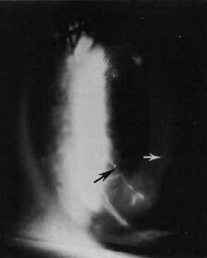 As opposed to the relatively mild effects of epithelial rejections and subepithelial infiltrates, an endothelial rejection reaction can result in rapid failure of a graft. The average time of onset in one series was 8 months,39 but the first episode of endothelial rejection may be seen as early as 2 weeks or as late as 35 years postoperatively. Symptoms may be mild or severe and patients may present with any combination of what we call the three danger signs of rejection: decreased vision, pain, and redness. We have found decreased visual acuity to be the most sensitive indicator of endothelial rejection and therefore counsel our patients to test their vision daily by viewing a household object under consistent lighting conditions. The patient is instructed to contact us immediately if there is redness lasting longer than 24 hours, decreased vision, or pain. The signs of endothelial rejection (Fig. 17) include circumlimbal injection, an anterior chamber reaction, keratic precipitates present on the graft, an endothelial rejection line, and graft edema. The anterior chamber reaction is usually mild, frequently with no more than 1+ cell or flare. The keratic precipitates may be diffusely scattered or grouped or may form an irregular line of precipitates (Khodadoust line) that begins at the graft periphery, often near an area of vascularization or synechial formation, and then progresses over the endothelial surface of the donor tissue, leaving in its wake a decompensated, edematous graft. Histologically, lymphocytes are seen adherent to the endothelial surface, often separating destroyed endothelium from normal appearing endothelial cells.