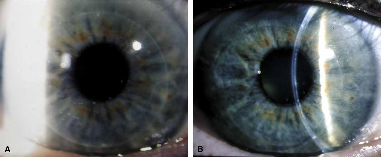 than either granular or macular dystrophy.51,52 Transmission of donor disease to the host may occur and can be serious or even life threatening. Reports in the literature on transplantation of infected donor tissue into previously healthy recipients reveal cases of bacterial endophthalmitis,53–58 fungal endophthalmitis,59–61 fungal keratitis,53 and bacterial keratitis.53 Transmission of rabies to four patients62–64 and Creutzfeldt-Jakob disease to one patient65 have led to the deaths of each of these individuals. Corneal grafts from 5 donors who were not previously known to be harboring HIV have been transplanted into 10 healthy recipients.67–69 Serial antibody testing for HIV has not indicated seroconversion over a period of at least 130 days. All corneal donors are currently tested for hepatitis B and C, syphilis, and HIV infection. Positive tests preclude the use of this donor tissue for transplantation. Infectious crystalline keratopathy is a serious, nonsuppurative, bacterial infection of the graft that may occur in patients maintained on chronic topical corticosteroids. It is caused by several different organisms, with Streptococcus viridans and anaerobic bacteria being the most frequent isolates. Cultures are often negative; therefore, corneal biopsy for histologic examination and microbiologic evaluation is recommended for accurate diagnosis. Epithelial irregularity or haziness secondary to chronic ocular surface disease, such as keratoconjunctivitis sicca or blepharitis, can cause decreased vision and may put the eye at risk for other problems, such as infectious keratitis, corneal melting, and stromal scarring. Fibrous ingrowth, also called retrocorneal membrane, results from the growth of fibrocytes across the posterior aspect of the graft. Epithelial downgrowth resulting from poor wound apposition, iris or vitreous incarceration, or possibly from introduction of epithelial cells into the eye at the time of surgery may also occur and will often present as a posterior corneal line similar in appearance to an endothelial rejection line (Fig. 18).70 Other findings include a fine translucent membrane on the surface of the iris that turns white with argon laser applications, large clumps of cells floating in the anterior chamber that do not resolve with the use of topical corticosteroids, and the rapid onset of severe glaucoma that is refractory to medical treatment. Other causes of increased IOP after penetrating keratoplasty include inflammatory anterior and posterior synechiae, iris incarceration leading to angle closure, mechanical compression of the trabecular meshwork by sutures, malignant glaucoma, corticosteroid-induced glaucoma, and preexisting glaucoma.71,72 Cataract formation or progression results from the surgical insult on normal lenticular physiology as well as from significant intraocular inflammation and chronic use of topical corticosteroids. Vitreous adhesions to the wound in aphakic or pseudophakic eyes may be associated with chronic uveitis and cystoid macular edema. Vitreous traction also increases the risk of a retinal tear or detachment.