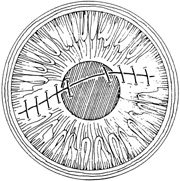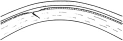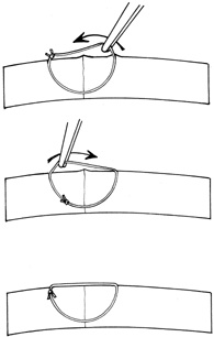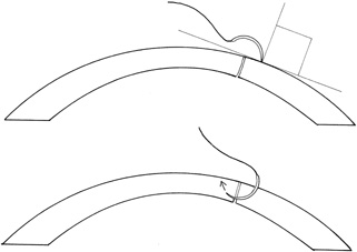 With more complex lacerations, good wound apposition with minimal distortion is the goal. An irregular wound is first subdivided into straight segments with interrupted sutures. Perpendicular areas of the laceration should be sutured before beveled ones to achieve watertight closure with the fewest number of sutures. As suggested by Rowsey and Hays,7 long, deep, and relatively tight peripheral wound sutures in combination with shorter, shallower, appositional sutures near the visual axis may help restore the normal corneal contour by restoring the relatively steep central corneal dome (Fig. 8). For irregular or curvilinear lacerations, all interrupted sutures should be placed perpendicular to the wound, thus avoiding transverse shifting of the wound margins. Although a running shoestring suturing technique may be used with straight lacerations to minimize astigmatism and facilitate subsequent suture removal, a running suture may tend to distort an irregular or curvilinear laceration because it will tend to form a straight line. Thus, if used, running suture bites should be placed perpendicular to and equidistant from an imaginary “regression” line through the wound rather than with respect to the wound itself (Fig. 9).