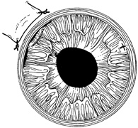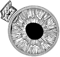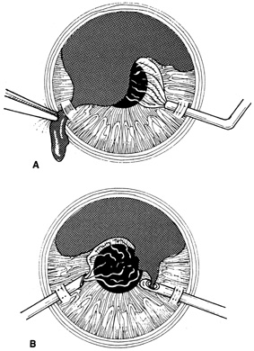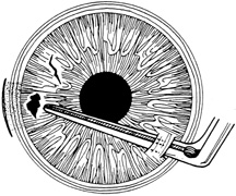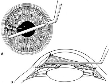 If an avulsed tissue pedicle is seen, it should be carefully replaced into position and sutured into place. Such avulsed tissue is best pulled into place by angling sutures toward the apex of the wound.6 CORNEAL LACERATIONS WITH UVEAL PROLAPSE. Iris incarceration and prolapse are frequently noted conditions that accompany corneal lacerations. A peaked pupil signals tissue incarceration. If prolapsed tissue is present, it must first be carefully examined. Usually, macerated, feathery, devitalized, or depigmented iris should be excised. The prolapsed tissue should be evaluated for any signs of surface epithelialization. In this case, it should be excised to prevent any epithelial cells from proliferating in the anterior chamber. In general, tissue that has been prolapsed for longer than 24 hours should be excised to avoid infection; however, if the tissue appears healthy, it may be replaced with caution. Any tissue to be excised should be gently grasped with fine forceps without applying undue traction. The tissue is then cut flush with the cornea. When excising any tissue, every effort is made to preserve as much as possible to maintain a normal iris diaphragm and conserve tissue for secondary reconstructive efforts.8 Incarcerated tissue will usually require mechanical reposition. Selected cases of mild incarceration may be treated with pharmacologic agents. Agents such as intraocular acetylcholine or carbachol cause pupil constriction, thus pulling iris from the wound. If incarcerated iris is located in the central cornea, mydriatic agents (e.g., intraocular epinephrine 1:10,000) may be used. If mechanical reposition is required, simply deepening the anterior chamber may release incarcerated tissue. Viscoelastic agents may be irrigated through the paracentesis port or the wound adjacent to the involved iris tissue in an attempt to draw the incarcerated iris from the wound (Fig. 12). If unsuccessful, a cyclodialysis spatula or irrigating canula may be passed through the paracentesis site and used to directly sweep incarcerated tissue free (Fig. 13). Care is always taken to avoid trauma to the corneal endothelium, iris, and lens. Any excised tissue should be sent to the pathology department for examination.
