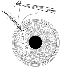 Temporary sutures may be used if the initial placement of deep definitive sutures would cause loss/flattening of the anterior chamber. These temporary sutures should be placed without distorting the wound. Accurate placement of the final definitive sutures can be achieved subsequently. The number of temporary sutures should be minimized, however, to prevent undue trauma to the wound margins and surrounding stroma. For corneal suturing, 10-0 monofilament nylon on a fine spatula-design microsurgical needle is used. This suture causes little tissue reaction, keeping vascularization and scarring at a minimum. Even finer 11-0 nylon suture may be used for lacerations near or involving the visual axis. Computed corneal topography analysis of corneal suturing techniques has suggested strategies designed to ensure adequate wound closure, minimize corneal scarring, and restore the native corneal contour.6,7 A number of options are available for suturing a corneal laceration. Tissue margins should appose as precisely as possible while suturing. The simplest method is to progressively halve the wound with simple interrupted sutures. Corneal sutures should be approximately 90% to 95% depth through the stroma, 1.5 mm in length, and of equal depth on each side of the wound. Shallow sutures create internal wound gape, whereas sutures of unequal length and depth on each side of the wound result in wound override. Sutures should generally not be passed through 100% thickness because the tract may theoretically act as a conduit allowing microorganisms from the external surface to enter the eye. For shelved lacerations, sutures should be placed equidistant with respect to the internal aspect of the wound and tied with minimal tension to achieve good tissue apposition, avoiding wound slippage with consequent tissue override (Fig. 5). Wounds with edematous or irregular margins generally require longer sutures for closure. Placement of sutures through the visual axis should be avoided. If it is necessary to pass sutures near the visual axis, they may be placed on each side of, but not directly through, the axis itself. In addition, the bite closest to the visual axis may be made shorter, thus avoiding this area (Fig. 6). A “no-touch” technique also may be used to minimize trauma at the visual axis. With this technique, the eye is secured by grasping the globe with forceps away from the cornea. The suture needle end is then placed perpendicular to the corneal surface, and the needle is rotated through the corneal tissue following the needle's curvature (Fig. 7).8