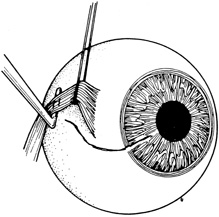 If the scleral laceration is gaped, uveal tissue is often prolapsed. Because excision of this tissue may be accompanied by severe bleeding and the possibility of cutting retinal tissue, every effort should be made to reposit this tissue. When prolapsed tissue needs to be excised for wound closure, it should be identified histologically. If retinal tissue is identified, this places the eye in a very poor prognosis category. In wounds that are posterior, it is more difficult to visualize and mechanically remove incarcerated or prolapsed vitreous. In these cases, the primary surgical goal is simply to secure a watertight closure of the globe because posterior vitreous prolapse and incarceration are usually accompanied by severe retinal damage that will require subsequent vitreous surgery.18 At times, scleral lacerations may extend far posteriorly, and may not be accessible. In these situations, it is preferable to leave the most posterior portion of the wound unsutured rather than to cause excessive globe distortion and prolapse of intraocular contents through extensive manipulation during suturing. If there is loss of scleral tissue, a patch graft using donor sclera may be sutured in place using interrupted nonabsorbably sutures. After the visible scleral laceration is repaired, the adjacent sclera as well as other quadrants should be explored to exclude additional injuries. Adjacent quadrants are cleared of overlying Tenon's capsule, and the sclera is exposed with the use of retractors. To facilitate manipulation and exploration of the globe, sutures of 4-0 silk or 2-0 cotton may be used to sling the rectus muscles for retraction. The sclera is thinnest behind the muscle insertions; thus, careful exploration of these areas is crucial. If the scleral laceration extends behind the muscle, it may be sutured while an assistant retracts the muscle (Fig. 19). If this is difficult, or if the full extent of the laceration is not viewed, the muscle may be disinserted after being secured with a double-armed 6-0 polyglactin 910 suture, which subsequently is used to reattach it at its original insertion.