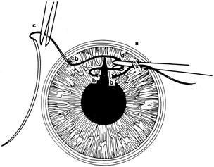 TRAUMATIC HYPHEMA Intervention Criteria Although hyphema is usually managed by medical and supportive therapy, approximately 5% of patients with hyphema will require surgical intervention.29–32 There are three general clinical indications for surgery predicated on (1) intraocular pressure, (2) corneal blood staining, and (3) amount of blood and inflammatory debris in the anterior chamber.29 Intraocular pressure criteria include intraocular pressure greater than 50 mm Hg for 5 days or greater than 35 mm Hg for 7 days to avoid optic nerve damage. Earlier intervention is indicated in patients with preexisting glaucomatous optic nerve changes and sickle cell disease because of their greater susceptibility to optic nerve damage and vascular occlusive disease. To prevent significant corneal blood staining, surgery should be performed at the first sign of blood staining on slit lamp biomicroscopy or in total or near-total hyphemas with intraocular pressure greater than 25 mm Hg for 5 days. To prevent formation of peripheral anterior synechiae, surgery is performed for large clots persisting longer than 10 days and for total hyphemas that have not resolved by day 5. These are generally conservative criteria. More urgent intervention may be helpful in selected cases. Surgical Techniques PARACENTESIS WITH ANTERIOR CHAMBER WASHOUT. This method is the easiest and safest procedure to clear blood from the anterior chamber (Fig. 21A).33 Two clear corneal paracentesis incisions approximately 2 mm long are made at the 10 and 2 o'clock positions or over the dependent portion of the hyphema. Balanced salt solution in a syringe with a 25- or 27-gauge cannula is used for irrigation through one paracentesis port into the anterior chamber. The posterior lip of the second paracentesis incision is depressed to allow the blood to exit. A dual-port manual or automated irrigation/aspiration system may also be used. Evacuation of the suspended free red blood cells and debris is desired; the formed clot itself may be left behind. This technique is safe, is easy to perform, and may be repeated as needed. Stromal hydration is used to seal the paracentesis ports. The conjunctiva is spared throughout the procedure in case future filtration surgery is warranted. AUTOMATED HYPHEMA REMOVAL. This technique is performed with an automated cutting/aspiration vitrectomy instrument and is used to remove more of the formed clot than is possible with the anterior chamber washout technique (Fig. 21B).34 A bimanual method is performed using the same paracentesis ports as in the anterior chamber washout method (above). This method is particularly useful if vitreous is present in the anterior chamber. Intraoperative bleeding may also be better controlled because the infusion can be used to tamponade the bleeding site. In addition, intraocular bimanual diathermy may be directly applied to bleeding vessels.35 A dual port vitrector with infusion line may also be used. In either case, extreme care must be taken to avoid trauma to the corneal endothelium, iris, and lens. LIMBAL CLOT EXPRESSION. For the management of large clots, limbal clot delivery has been suggested (Fig. 21C).36 This technique should not be performed until the clot reaches maximal consolidation and retraction at days 4 to 7.37,38 Expression of the clot may be combined with peripheral iridectomy and anterior chamber washout. Important disadvantages of this procedure include the large incision required and the possible inadvertent expression of iris, lens, and vitreous. OTHER PROCEDURES. For larger hyphemas causing pupillary block glaucoma, a peripheral iridectomy in combination with anterior chamber washout may be used.39 Trabeculectomy combined with peripheral iridectomy and anterior chamber washout may also be used and may allow better intraocular pressure control postoperatively.40 Rebleeding occurs in 3.5% to 38% of patients with traumatic hyphema and most frequently occurs 2 to 5 days after injury.41–55 Surgical intervention is based on similar conditions such as elevated intraocular pressure, corneal blood staining, and the formation of peripheral synechiae TRAUMATIC IRIS INJURY Iris disruption is a frequent concomitant of both lacerating and blunt anterior segment trauma. Surgical repair of iris damage resulting from lacerating injury is usually best performed in a later operation, especially when visibility is compromised during the primary procedure (see section on anterior segment reconstruction). Small sphincter tears are best left untouched. Larger sphincter tears, which may result in mydriasis, glare, and photophobia, may be managed pharmacologically with topical miotic agents or by the use of a tinted contact lens or sunglasses. Eccentric or secluded pupils can be managed by laser procedures in some cases. Surgical reconstruction of the iris in a closed system has been described by McCannel56 (Fig. 22). In a phakic eye, one must avoid injuring the anterior lens capsule and creating a traumatic cataract. Viscoelastic should thus be placed between the posterior iris and anterior lens capsule for protection. A limbal paracentesis is performed in a position that allows the suture needle to pass across the edge of the iris defect. Because it is less susceptible to hydrolysis and biodegradation, 10-0 polypropylene on a long needle (e.g., CIF-4, Ethicon) is used.57 The needle is introduced through the paracentesis port into the anterior chamber and then passed through the proximal edge of the iris laceration and then through the distal edge in one pass. The needle is then passed through the peripheral cornea out of the eye. After the needle is cut from the suture, a microhook is passed through the paracentesis port and retrieves the distal suture end, pulling it back through the paracentesis and outside the anterior chamber. The original suture end should be kept outside the eye at all times. The suture is then tied securely by pulling the iris up to the parace