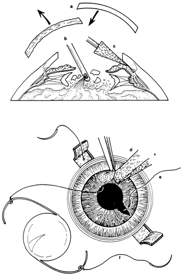 Intraocular Lens Placement A number of factors determine the propriety of intraocular lens placement either as a primary or secondary procedure after traumatic cataract extraction. In general, intraocular lens implantation should be reserved for adults, although some have recommended intraocular lens implantation after trauma in children and have reported success with this technique.59 Moreover, although intraocular lens correction may result in the best optical result for some patients, rigid contact lens correction may neutralize irregular astigmatism created by a corneal scar in others and thus be preferable. If the posterior capsule is intact with no loss of vitreous or anterior segment disruption, a posterior chamber intraocular lens may be placed. This type of lens may sometimes be inserted into the ciliary sulcus in cases in which there is peripheral capsular support and/or Soemmering's ring.60 If adequate posterior capsular support is not present, an anterior chamber intraocular lens may be placed if there is adequate iris support and the anterior chamber does not contain blood or vitreous. If the corneal endothelium or angle has been compromised, it is best not to place an anterior chamber intraocular lens. Transscleral sutured posterior chamber lenses may be considered after adequate vitrectomy has been completed.61 If there are any concerns with regard to intraocular lens implantation during primary globe repair, it is acceptable to defer and electively implant an intraocular lens at a later date SECONDARY ANTERIOR SEGMENT RECONSTRUCTION Regardless of a well-planned, meticulous primary surgical repair in the patient who has sustained trauma to the eye, devastating complications may result from normal wound-healing mechanisms. Such complications include corneal scarring, fibrovascular pannus, and astigmatism; glaucoma secondary to peripheral anterior synechiae, pupillary block, or lens-induced inflammation; vitreous incarceration within ocular wounds and associated chronic inflammation, cystoid macular edema, retinal detachment, and infection; pupillary or cyclitic membranes; conjunctival scarring, and symblepharon; and ocular surface epithelial damage with long-term consequences, including persistent epithelial defects, stromal vascularization, sterile stromal ulceration, and poor prognosis for penetrating keratoplasty. To achieve the optimal post-injury outcome, these late complications need to be avoided or, if present, ameliorated. Various surgical techniques may help to restore the normal globe architecture and minimize complications, thus resulting in improved visual rehabilitation (Fig. 25).62 Penetrating keratoplasty is generally reserved for secondary anterior segment reconstruction when the eye is free of inflammation and infection, thus optimizing graft survival.8,63,64 When keratoplasty is performed in the post-trauma setting, an eight-bladed radial keratotomy marker may be used to delineate the principal meridians for suture placement. A gentian violet tissue marking pen is used to coat the edges of the radial keratotomy marker, after which impressions are made on the host cornea. Disposable cautery is then used to augment these marks at the limbus. This allows for optimal graft alignment and suture placement. A Flieringa ring may also be used, especially in aphakic and myopic eyes, to prevent scleral collapse after trephination. If it is believed that a sutured-in posterior chamber intraocular lens will be placed, a conjunctival peritomy and scleral flaps are first prepared. The purpose of these scleral flaps is to cover the polypropylene suture knot and prevent its erosion through the conjunctiva. The flap may be triangular or rectangular and should be one half of the scleral thickness and approximately 4 mm at its base. The flap should be adjacent to the limbus. After trephination and removal of the corneal button, any lens fragments should be removed to enhance visualization and minimize postoperative inflammation and scarring. Open-sky anterior vitrectomy is commonly performed using an automated vitrector without irrigation. Vitreous that is incarcerated or fibrotic should be removed to prevent complications such as cystoid macular edema, chronic inflammation, and retinal detachment. Because vitreous touch to the donor cornea may predispose toward graft failure, all vitreous in the anterior chamber should be removed. At the end of vitrectomy, the iris diaphragm should fall back into its normal position without vitreous in the anterior chamber. Peripheral anterior synechiae should be lysed to help improve aqueous outflow and lessen the chance of developing postoperative glaucoma.65,66 Because progressive closure (“zippering”) of the angle is a severe complication of penetrating keratoplasty, meticulous synechialysis should be undertaken using blunt dissection. Dry cellulose sponges are an excellent tool for this maneuver. Another goal of synechialysis is to free any scarred or incarcerated iris tissue for reconstructive iridoplasty. In traumatized eyes, organized fibrovascular and fibrocellular membranes may form in the anterior chamber, over the anterior iris, angle, and posterior cornea. Once identified, these membranes should be carefully stripped and peeled to avoid further complications such as fibrosis and contraction with consequent synechia formation, angle compromise, and ciliary body detachment. The goals of iris reconstruction or iridoplasty are maintenance of a taut iris diaphragm to prevent synechia formation and secondary glaucoma63,67; prevention of iridocorneal adhesions and glaucoma, thus improving graft survival; reconstruction of the pupil for cosmesis as well as to minimize glare; and formation of a stable iris diaphragm, allowing support for an anterior or posterior chamber intraocular lens.68–70 The removal of scar tissue, membranes, and vitreous should take place before iridoplasty. Sector iridectomies should be sutured closed. This