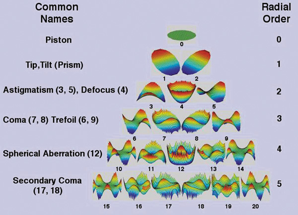 the low-order aberrations of spherical error and astigmatism.59,60 Aberrations are most commonly expressed mathematically as Zernicke polynomials, whose terms can be arranged in a pyramidal fashion (Fig. 15). Two of the most important aberrations are spherical aberration (Fig. 16), which commonly causes a perception of glare and halo, particularly at night, and coma, which causes a smear in a direction like the tail from a comet (Fig. 17).