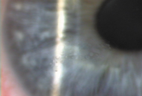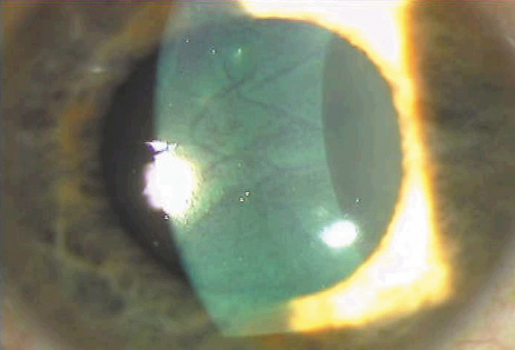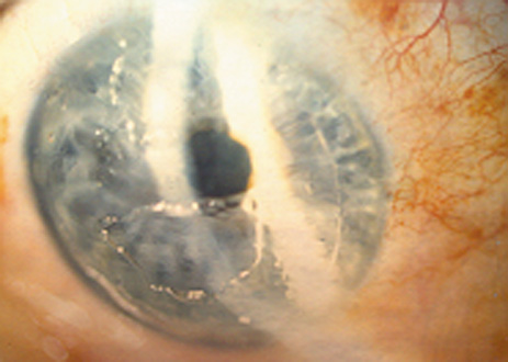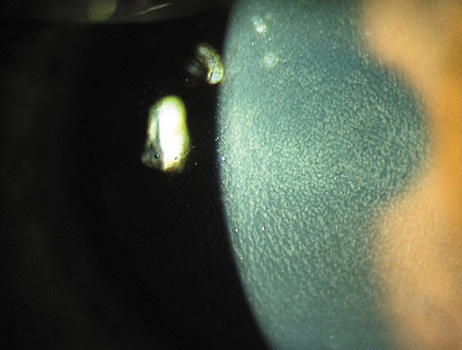 INTERFACE DEBRIS Debris in the interface occasionally is seen postoperatively. The principal indication for intervention, with flap lifting, irrigation, or manual removal of debris, occurs when the foreign material elicits an inflammatory reaction. Small amounts of lint, nondescript particles, or tiny metal particles from stainless steel surgical instruments usually are well tolerated. On the other hand, although a small amount of blood that has oozed into the interface from transected peripheral vessels may be tolerated, any significant amount of blood usually elicits an inflammatory cell response and should be irrigated from the interface. Use of a topical vasoconstrictor such as epinephrine to facilitate coagulation at the time of replacing the flap helps to minimize this problem. ECTASIA The importance of an adequate residual stromal bed to prevent structural instability and postoperative corneal ectasia is discussed in the section on preoperative evaluation. Current standards recommend a minimum residual stromal bed of at least 250 μ after completion of the ablation.94 Although keratectasia usually is associated with LASIK performed for higher myopic corrections; in thin corneas or patients who have had multiple laser ablations, cases of ectasia have been reported in corrections as low as −4 D where the residual stromal was believed to be thicker than 250 μ.95 In many of these cases, later examinations have shown that the microkeratome created a flap thicker than expected, resulting in a thinner residual stromal bed.96 In other cases, preoperative subtle keratoconus or other ectasias may have been present. In many cases, good vision can be restored with a rigid gas permeable contact lens. The use of implanted intrastromal polymethylmethacrylate segments to reduce the irregular astigmatism is under investigation.97 Penetrating keratoplasty may be required in extreme cases. |