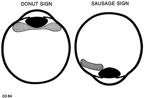 opacity and cataract formation. Glaucoma can develop from association with intraocular gas bubbles. Overfilling of the eye with expansile gas and consequent central retinal artery occlusion have led to permanent blindness.98 Medium size fills and inadequate attention to prone positioning can cause peripheral anterior synechiae with total angle closure. Sharp increases in intraocular pressure can occur if the patient remains supine, because fluid from the ciliary body continues to fill the posterior segment while the air bubble blocks fluid egress through the trabecular meshwork. Changes in atmospheric pressure, such as air travel or driving rapidly up a steep mountain, can lead to painful pressure increases and loss of vision. In order to avoid loss of vision in patients with a gas tamponade due to nitrous oxide anesthesia during an unanticipated emergency, a gas identification bracelet should be issued at the time of their vitreoretinal procedure. Indirect and slit-lamp laser treatment can cause undesirable burns from reflections of internal fluid–air and air–fluid surfaces. To reduce this risk, one should avoid treatment through a gas–fluid or fluid–gas interface whenever possible.100 When treatment through such an interface is unavoidable, it should be done as perpendicular to the interface as possible, because the intensity of a reflected beam increases as the angle of incidence decreases. A divergent beam should be used. The location and the intensity of internally reflected beams should be evaluated with the aiming beam before photocoagulating the area of interest. Polarization of the laser beam could potentially reduce the problem of internal laser reflectance. Changes in beam intensity caused by reflectance and relative magnification encountered when switching from treating through a gas bubble to treating around it can lead to overintense burns and result in retinal and choroidal hemorrhages. Some complications are particularly important to pneumatic retinopexy. Endophthalmitis has been encountered on two occasions. Undiluted povidone-iodine (Betadine) solution was not used in either case. The use of povidone-iodine is exceptionally important in pneumatic retinopexy or any transconjunctival injection into the vitreous because it kills bacteria on contact. Topical antibiotics are not adequate because they require a long time to act and may be merely bacteriostatic rather than bactericidal. The conjunctiva should be dried with a sterile cotton-tipped applicator just before injection through the site to avoid placing potentially contaminated and iodine-containing fluid into the vitreous cavity. Endophthalmitis has been reported with the use of gases in vitrectomy surgery, but it is not clearly related to the use of the gas. Gas for intraocular injection is aspirated through a 0.22-μm filter for sterilization. Many surgeons use two such filters in series to reduce risk of contamination by failure of one filter membrane. If the injecting needle used during pneumatic retinopexy is not first inserted deep into the vitreous before pulling it back to approximately 2 mm, gas can be trapped in the anterior hyaloid. This produces a donut- or sausage-appearing gas pocket anteriorly (Fig. 6). The gas may break free into the vitreous after 1 or 2 days. Many surgeons prefer to aspirate the gas immediately and reinject it deeper into the vitreous. If multiple small bubbles are formed at injection and not eliminated before positioning them beneath the retinal tear, subretinal gas may be found. New tears occur in 7% to 23% of patients treated with pneumatic retinopexy. New tears are also found in approximately 13% of patients treated with scleral buckling. Iris-supported intraocular lenses may flatten against the cornea after posterior fluid–gas exchange. Several remedies have been proposed for this problem, including injection of hyaluronic acid into the anterior chamber, injection of air into the anterior chamber, and placement of anterior chamber sutures to prevent the implant from touching the corneal endothelium.101 Fortunately, the implantation of this kind of lens is now rare. The rigid angle-supported anterior chamber lens and the posterior chamber intraocular lens rarely touch the cornea with fluid–gas exchange of the posterior segment. |