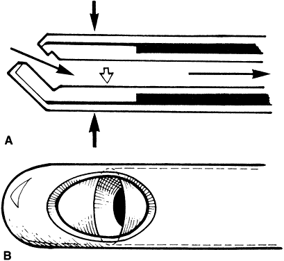 PVR occurs in 5% of all retinal detachments when retinal pigment epithelial cells, glial cells, or bothproliferate on both surfaces of the retina and on vitreous membranes. Signs of PVR include fixed folds, detachment of the nonpigmented epithelium of the pars plana, and equatorial folds. Preretinal and subretinal membranes cause shortening of the retina (Fig. 23). If a higher scleral buckle does not close the retinal breaks, release of traction is essential for reattachment. The first step is to search carefully for any open retinal breaks. In recurrent retinal detachment, look at the original break or breaks first. In reoperations for PVR, breaks on the posterior slope of a previously placed buckle at the edge of a cryotherapy scar account for 40% of all new or previously identified breaks.89 The vitrectomy instrument is used to remove as much formed vitreous as is safely possible and to cut transvitreous membranes, releasing vitreous traction. Bent needles or forceps are used to peel preretinal membranes from the retinal surface to restore retinal flexibility (Fig. 24).
