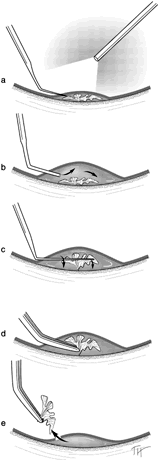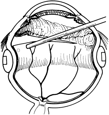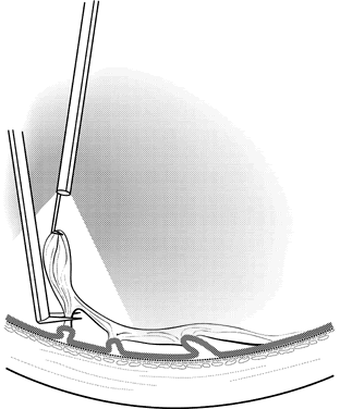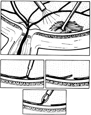 Membrane delamination usually is a bimanual technique for vascularized membranes such as in PDR. Using an illuminating pick to elevate the vascularized membrane, adhesions between the fibrovascular tissue and retina are cut with horizontal scissors (Fig. 25). Fibrovascular membranes often are extremely adherent to the retina and may overlay thin, ischemic retina. If a retina break is created in membrane removal, all traction must be removed completely from the retina. Viscodelamination, which is the use of a viscoelastic solution to create a cleavage plane between the membrane and retina, may assist in delamination.90,91 The delamination technique is used for en bloc resection of membranes.92–95 With the en bloc technique, the posterior hyaloid is left intact after a core vitrectomy. The hyaloid provides counter-traction to the membranes being delaminated. The delaminated membranes and posterior hyaloid are then removed as a single unit (en bloc).