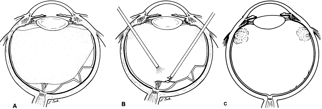 The prognosis for IOFB is relatively favora-ble.249–251 In the study by Greven and associates,251 71% of patients achieved a visual acuity of 20/40 or better. Factors that portent a poorer prognosis include poor initial visual acuity, larger wounds (over 4 mm), and vitreous hemorrhage.249 Penetrating BB-gun injury carries a poor prognosis.250,252 Traumatic endophthalmitis and IOFBs are the current indications for prompt vitrectomy. Otherwise, the timing for vitrectomy after closure of the ruptured globe is controversial. At Wills Eye Hospital, we typically intervene 7 to 10 days after the initial repair for retinal detachments, choroidal hemorrhages, and vitreoretinal traction. At 7 to 10 days, there is a higher chance for the development of a posterior vitreous detachment, which facilitates surgery. The risk of intraoperative hemorrhage is less than if earlier intervention is performed. In addition, the delay in surgery allows for liquefaction of SCH, if present. Finally, experimental evidence indicates that a vitrectomy performed within 2 weeks of severe injuries prevents later traction retinal detachment.253,254 In surgery, an anteroposterior approach is taken. Hyphema evacuation, lensectomy, and drainage of choroidals are performed. Next, a vitrectomy is done to clear the media. If epiretinal membranes are present, they should be removed. A retinotomy may be needed for retinal incarceration or PVR. If peripheral breaks are present, one may consider a scleral buckle with or without an encircling element. All breaks should be surrounded with cryotherapy or laser. PFCLs may assist in retinal reattachment. Long-acting gases or SO should be used for postoperative tamponade. ENDOPHTHALMITIS Vitrectomy has shown to be of benefit in acute endophthalmitis (less than 6 weeks) after cataractsurgery. The Endophthalmitis Vitrectomy Study (EVS) was a randomly assigned, prospective clinical trial evaluating treatment strategies for acute endophthalmitis after cataract surgery or secondary IOL surgery.255 The EVS compared treatment outcomes of intravitreous antibiotics with either immediate PPV or vitreous tap/biopsy and also evaluated the value of intravenous antibiotics. All groups received intravitreous, subconjunctival, and topical antibiotics. The EVS treatment outcomes showed that there was no significant difference in visual acuity or media clarity outcomes, whether systemic antibiotics were administered. The study also showed that only patients with vision LP or worse benefited from vitrectomy. In this subgroup, 33% of patients undergoing vitrectomy and intravitreous antibiotics had 20/40 visual acuity or better versus 11% of patients undergoing vitreous tap with injection of intravitreous antibiotics. In this subgroup, vitrectomy reduced the rate of severe visual loss from 47% to 20%. However, if the vision was hand motions or better, there was no treatment difference between vitrectomy/intravitreous antibiotics and vitreous tap/intravitreous antibiotics.255 The choice between vitreous tap/biopsy versus vitrectomy foracute postoperative endophthalmitis is based mainlyon the presenting visual acuity put forth in the EVS group publications. The results of the EVS should not be extrapolated to cases of delayed-onset or endogenous endophthalmitis. Several recent reports suggest that vitrectomy, capsulectomy, and intravitreous antibiotics is the best initial approach for chronic endophthalmitis.256,257 Similarly, cases of endogenous endophthalmitis with moderate-to-severe vitreous involvement may benefit from initial vitrectomy.258,259 As discussed above, prompt surgical intervention for IOFBs is indicated and may reduce the incidence of endophthalmitis.260 UVEITIS Cataract is a common late complication of severe uveitis. In addition, the vitreous may be opacified by numerous vitreous cells and dense membranes. Some surgeons believe that the best results are obtained with a combination pars plana lensectomy and vitrectomy,261 but good results have been reported with cataract surgery alone.262 In most cases, a posterior chamber lens can be placed.263 All authors stress, however, the necessity of intensive preoperative and immediate postoperative corticosteroid therapy to diminish the inflammatory response to the surgery. Severe inflammation as seen in Toxocara canis vitreoretinal abscesses may cause strong vitreous traction resulting in traction retinal detachment or dragged macula. Vitrectomy is the procedure of choice to prevent these complications.264 VIRAL RETINITIS-RELATED RETINAL DETACHMENTS Herpes-family viruses can cause extensive retinitis and secondary retinal detachments. Cytomegalovirus is seen almost exclusively in immunocompromised patients, whereas herpes simplex or herpeszoster is seen in both immunocompetent and immunocompromised patients. The term acute retinal necrosis (ARN) has been used to describe this type of viral retinitis in immunocompetent patients. These types of retinitis have in common the high propensity of patients to have multiple posterior retinal breaks develop during the healing phase of the disease. Retinal detachments have been reported to occur in up to 50% of cytomegalovirus retinitis cases265 and in 50% to 75%266,267 of ARN cases. PVR usually is not seen in these detachments except for ARN in immunocompetent patients. These detachments typically are repaired with PPV and SO tamponade, especially if the retinitis has been extensive and retinal holes numerous.139 In cytomegalovirus detachments, recent studies have shown more encouraging results.140,268 In the study by Lim and associates,140 71% of patients treated with vitrectomy and SO achieved 20/200 or better visual acuity. Primary vitrectomy in retinal detachments with ARN appears to offer the best prognosis because the breaks are multiple and posterior and PVR often is present. In one study of ARN detachments, there was a 94% final anatomic success rate.269 VITREOMACULAR TRACTION Abnormal vitreoretina