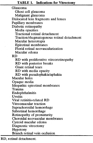 needed for surgery. Over the years, considerable advancement has been made in vitreoretinal instrumentation, including high-speed vitrectomy cutters, illuminated forceps and picks,8 and the diamond-dusted silicone tip cannula.9,10 Other improvements include less-toxic irrigating solutions,11–13 improved contact lenses, safe intraocular diathermy, flexible iris retractors,14 and endolaser photocoagulation. Motorized scissors have dramatically decreased the incidence of iatrogenic retinal tears because membranes that formerly had to be peeled from the retina can now be segmented. Special mention must be given to the pioneering work by Chang15 with perfluorocarbon liquids (PFCLs), which are a major advance in the unrolling of giant tears and in the evacuation of subretinal fluid in selected cases. Silicone oil (SO), first introduced by Cibis in 1962, has been increasingly used since the early 1980s.16,17 The latest major advance in vitreoretinal surgery has been the introduction of wide-field viewing systems, which allow a panoramic view of the retina.18,19 These technologic advances have helped to expand the indications for vitrectomy greatly (Table 1).