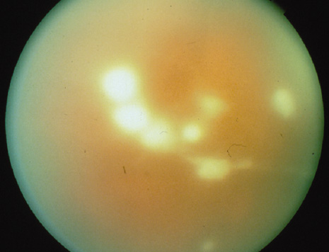 The typical clinical features of Candida endogenous endophthalmitis include fluffy yellow or white vitreous opacities and creamy white chorioretinal infiltrates (Fig. 13). Anterior uveitis frequently accompanies the posterior segment findings. A large macular abscess and pseudohypopyon formation (layering of inflammatory material under the internal limiting membrane of the retina) is not uncommon in cases of endogenous Aspergillus infection.25 The management of endogenous endophthalmitis depends on the clinical features (fungal vs. bacterial), the specific organism isolated, and the severity of infection.24–27 Once a diagnosis of endogenous endophthalmitis is suspected, evidence for other organ involvement must be sought. This is usually accomplished in consultation with an infectious disease specialist or internist. The presumptive clinical diagnosis is made by positive blood or urine cultures or by focal active infection of nonocular tissues. The management approach in cases of suspected endogenous Candida endophthalmitis is generally tailored to the clinical situation. When chorioretinal infiltrates are present with no or minimal vitreous involvement, systemic therapy alone is recommended. With moderate-to-severe vitreous involvement (Fig. 14) or in cases with a worsening course in spite of systemic therapy, vitrectomy and intraocular amphotericin B are generally recommended. Although many antifungal agents are not available for intravitreal administration, voriconazole and miconazole are treatment options for amphotericin-resistant fungi (Table 9).