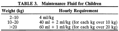 All patients have obligate fluid loses due to respiration, urination, and sweating. This loss is a large percentage of extracellular fluid volume in the child. Therefore, it is necessary to replace the fluid deficit that has occurred while fasting. Deficit fluid is calculated by multiplying the maintenance volume by the number of hours of fasting (i.e., a 10-kg child fasting for 8 hours requires: [10 kg × 4 ml/kg/hr] × 8 hr = 320 ml). Half of this deficit should be replaced in the first hour of surgery, and the remainder during the second and third hours. RL is usually administered for this purpose. Because nausea and vomiting are common postoperative complications after extraocular muscle surgery, postoperative dehydration may be avoided or decreased by administering all the fluid deficit in the perioperative period. Acute sequestration of fluid to a nonfunctional interstitial compartment, also known as third-space loss, is usually minimal for ocular surgery but greater for thoracic or abdominal procedures. The estimated loss (1 to 10 ml/kg) is added to the maintenance rate using RL. Blood loss must be replaced with clear fluid (RL or NS) at a ratio of 2:1 or 3:1, or with albumin, packed red blood cells, or whole blood at a lower ratio of 1:1 replacement. Which fluid is chosen depends on the expected total amount of blood loss, measured blood loss, availability of blood products, and minimum hematocrit allowable for the individual patient. A fluid challenge (RL or albumin) may be given in 10 ml/kg increments. |