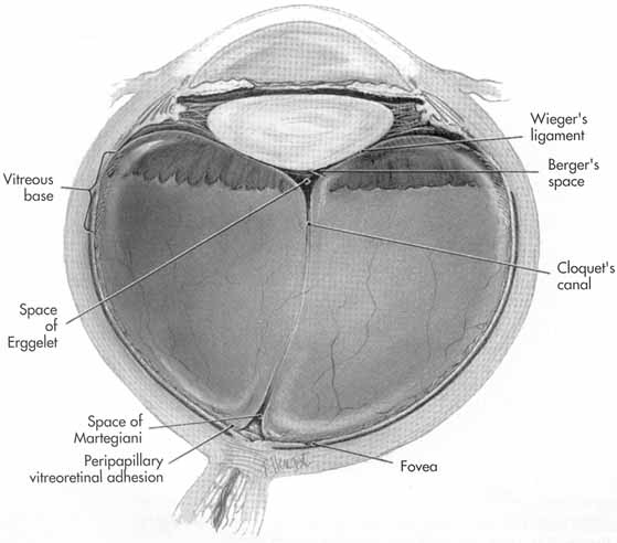 The vitreous body is a clear, transparent, gel-like substance that fills the eye between the lens and retina (Figs. 24, 25). It is 16.5 mm in axial length with a volume of approximately 4 mL, comprising approximately two-thirds the volume of the globe. Because the vitreous is approximately 99% water, it has a specific gravity of 1.0053 to 1.0089 and weighs approximately 4 g.170–171 The refractive index of the vitreous is 1.334.172–174 Its viscosity is 1.8 to 2 times that of water in mL.175,176 Its gel-like consistency is caused by a matrix composed of small-diameter collagen fibrils (12–25 nm) in hyaluronic acid. Soluble proteins and small molecules are also present in small amounts.177 The shape of the vitreous is somewhat spherical, conforming to the space in which it is present. Anteriorly, the patellar fossa represents a depression in the vitreous face adjacent to the posterior lens capsule. The vitreous is loosely attached to the ciliary processes and zonular fibers of the lens at an annular region 1 to 2 mm in width and 8 to 9 mm in diameter called the hyaloideocapsular ligament (of Wieger),178,178a and this attachment becomes looser with age. At the center of the hyaloideocapsular annulus is “Erggelet's”179 or “Berger's”180 space. Arising from this space is the canal of Cloquet, which runs posteriorly through the central vitreous to a funnel-shaped region anterior to the optic disc, the area of Martegiani.181 The lumen of Coquet's canal, which represents the remnant of the hyaloid artery,178,182,183 is devoid of vitreous collagen filaments and is surrounded by multifenestrated sheaths that were the basal laminae of the hyaloid artery wall.184,185 The canal lies mainly below the horizontal meridian and has an S-shaped course with the downward dip of the canal in its central portion. Anteriorly, the canal is about 1 to 2 mm wide. In the area of the patellar fossa it measures 4 to 5 mm. The vitreous base refers to a three-dimensional zone extending from 1.5 to 2 mm anterior to the ora serrata, to 1 to 3 mm posterior to the ora serrata, and including several millimeters into the vitreous body itself.149,186 The posterior portion of the vitreous base contains thicker collagen fibers that are more densely packed.187 Just posterior to the ora serrata, heavy bundles of vitreous fibrils attach to the basal laminae of retinal glial cells.149 The cortex of the vitreous, which circumscribes the entire vitreous, is approximately 100 μm in thickness and consists of a condensation of collagen fibrils, cells, proteins, and mucopolysaccharides.112,149,188,189 The cortical vitreous is more dense than the central vitreous. The anterior vitreous cortex, also referred to as the anterior hyaloid face, runs anteriorly from the anterior vitreous base.112 Fibrils in the vitreous cortex at the ora serrata range in diameter from 10.8 to 12.4 nm.187 The posterior vitreous cortex, or posterior hyaloid face, is adjacent to the retina and runs posterior from the ora serrata. The posterior vitreous cortex consists of densely packed collagen fibrils. At the meeting of the retina with the vitreous cortex, an electron-lucent space of approximately 40 nm is present separating the cortex from the internal limiting membrane.150 Delicate fibrils extend across this lucent space.152 The vitreous is strongly adherent in two places.68,190 Anteriorly, it is firmly attached to the nonpigmented epithelium of the ciliary body. The attachment is approximately 2 to 3 mm in width, encompassing the posterior aspect of the pars plana and the most anterior aspect of the peripheral retina. Posteriorly, it is attached around the optic disc but not to the disc itself. There also may be strong attachments around the macula in some individuals.191,192 The vitreous may also be somewhat adherent to the retinal vessels.193,194 |