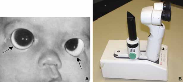 Portable slit lamp biomicroscopy is a useful technique for evaluation of the anterior segment (Fig. 1B). It is preferable to have a model with zoom optics and the capability of photography like the Kowa II portable slit lamp. This is optimal for obtaining good pictures and making the most accurate drawings of any abnormalities.3 Gonioscopy can then be performed with the Koeppe lens in place, but the lens must be removed for tonometry. If the cornea is heavily scarred or the globe is grossly distorted, then intraocular pressure must be estimated by palpation. After examination of the anterior segment, fundoscopy or other indicated studies (ERG, ultrasonography) can be performed. In some cases, severe corneal opacification will prevent visualization behind the cornea, and ultrasound biomicroscopy should be used to detect other anterior segment or vitreoretinal abnormalities.4 A complete infant ocular examination can be performed in approximately 2 hours. |