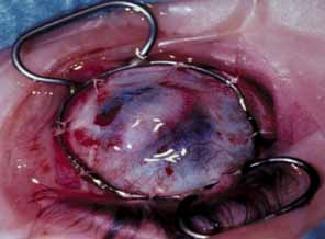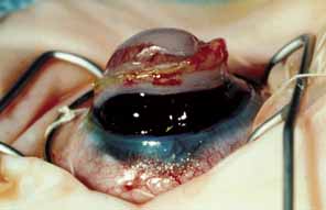 Across multiple studies, several factors have been identified as prognostic indicators for graft clarity and survival in children undergoing penetrating keratoplasty for congenital corneal opacities.166,168–170 Avascular corneas having a central opacity with a clear periphery have a 50% to 75% likelihood of graft clarity after 2 years. Eyes with either a vascularized cornea or other associated ocular pathology, including anterior synechiae or corneolenticular adhesions, are less likely to achieve graft clarity, with a 20% to 30% chance of success. Eyes with vitreoretinal disorganization demonstrated by ultrasound are inoperable. Depending on the complexity of disease and associated pathology, some eyes may need to undergo intraoperative lensectomy along with vitrectomy, further increasing the risk of graft failure. Another source of graft failure is a nonhealing epithelial defect on the donor graft. This can be produced by factors such as abnormal tear production or eyelid abnormalities, such as distichiasis, which must be screened for preoperatively. In the event of graft failure, repeat penetrating keratoplasty can be performed; however, most studies indicate that these regrafts have a higher risk of failure than the original corneal transplant. Elevated intraocular pressure is commonly present in congenital anomalies and can complicate surgery as well as postoperative management. Either a filtering procedure or cyclocryotherapy can be attempted preoperatively or during the transplant as a means to control intraocular pressure. It is also important to include pressure-lowering medications as part of management. Maintaining normal intraocular pressure is an important means to improving the outcome and the chance for a clear graft. Psychosocial factors, as much as medical factors, also play a role in determining the success of corneal grafts. An unstable family or inadequate socioeconomic circumstances are grounds for avoiding keratoplasty in young children. Parents will cooperate more when they have had detailed preoperative discussions with the ophthalmologist, when they have received direct instruction in topical medication delivery, when they fully understand the need for long-term patching to treat amblyopia, and when they are well instructed about proper use of spectacles and contact lenses. A responsible adult must be able to perform a careful daily examination for signs of corneal graft rejection, such as graft edema and circumcorneal injection. The physician who enlists social service support and helps the family to obtain financial support to cover the costs of surgery and postoperative care will enhance the likelihood of prolonged graft clarity. Referring and consulting ophthalmologists must communicate frequently and clearly to ensure careful follow-up of the child. SURGICAL TECHNIQUE This surgical procedure is technically more difficult than penetrating keratoplasty in adults; it is probably the most complex challenge a corneal transplant surgeon can face. The decreased rigidity and increased elasticity of the infant cornea and sclera are well-recognized factors that make transplantation of the infant cornea more difficult. Even when preoperative massage, intravenous mannitol, pharmacologic paralysis of the extraocular muscles, and a Goldman-MacNeil type scleral ring are used, the lens and the iris move forward dramatically as soon as the anterior chamber is entered and spontaneous extrusion of the lens is not rare (Fig. 28). Presumably, this occurs because the posterior sclera collapses like a plastic bag full of water when it is opened. Because it is often difficult to visualize anterior segment structures, the initial trephination should be made only partial-thickness, and a knife should then used to gently cut down into the anterior chamber. Frequently, the surgeon will encounter iris directly and must carefully manipulate the cornea while trying to determine the extent of keratoiridial adhesions and associated anterior segment anomalies. Sometimes having a surgical assistant lift on the scleral ring gently will allow the intraocular contents to fall backward and give the surgeon time and room to place the first four cardinal sutures in the keratoplasty and seal the eye.
