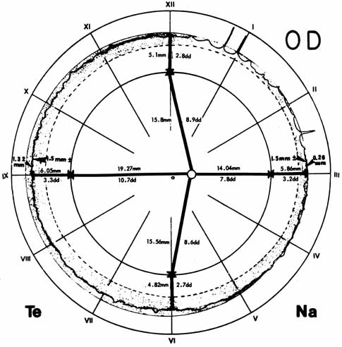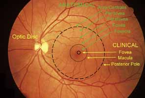 Gross retinal topography reveals characteristic regional variations. The clinical posterior pole is the central posterior retina approximately 5 to 6 mm in diameter, lying between the two temporal retinal arteries (Fig. 2). It is referred to anatomically as the area centralis or macula. Histologically, it is the only region of the retina with more than one layer of ganglion cells. The clinical macula, or the anatomic fovea, is the central area approximately 1.5 mm in diameter within the area centralis. The name macula lutea was given to this region because of the slightly yellow coloration of this area resulting from the presence of xanthophyll in the ganglion and bipolar cells.2 Within the center of the anatomic fovea lies a depression approximately 0.35 mm in diameter surrounded by a ring of slightly thickened tissue. This region is called the foveola by anatomists and the fovea by clinicians. It lies within the capillary-free zone, which measures approximately 0.4 mm in diameter in most people. The photoreceptors in this region characteristically consist of pure cones. The center of the pit within the foveola is called the umbo. It is located 3.4 ± 0.34 mm from the temporal edge of the disc margin and 0.8 mm inferior to the center of the optic disc.3 The anatomic fovea is surrounded by a 0.5-mm-wide ring zone called the parafovea. This area is where the ganglion cell, intranuclear layer, and outer plexiform layer are the thickest. A 1.5-mm ring zone surrounding the parafovea is called the perifoveal area.