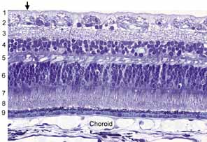 The retina is a diaphanous, transparent tissue that lines the inner posterior three-fourths of the eyewall.1 It extends from the macula in the posterior pole to a location approximately 5 mm anterior to the equator, the ora serrata, where it becomes contiguous with the nonpigmented epithelium of the pars plana ciliaris. It is loosely adherent to the underlying pigment epithelium, and the two tissue layers can easily be separated in postmortem specimen. The only firm attachments of the retina are at the margins of the optic disc and at the ora serrata (Fig. 1). In living eyes, the retina also is attached to the overlying vitreous in a circular band around the retinal periphery, referred to as the vitreous base. Other points of attachment between the retina and the vitreous may exist around the optic disc and in the macular region.