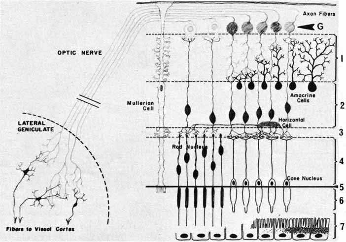 Data from Boycott BB, Dowling JE: Philos Trans R Soc Lond, Ser B No. 799, 225:109, 1969; Kolb H, Famiglietti EV: Invest Ophthalmol Vis Sci 15:935, 1976; and Gouras P, Zrenner E: Color vision: A review from a neurophysiological perspective. In Autrum H, Ottoson D, Perl ER, Schmidt RF (eds): Progress in Sensory Physiology, Vol 1. Berlin: Springer-Verlag, 1981.