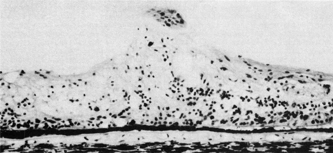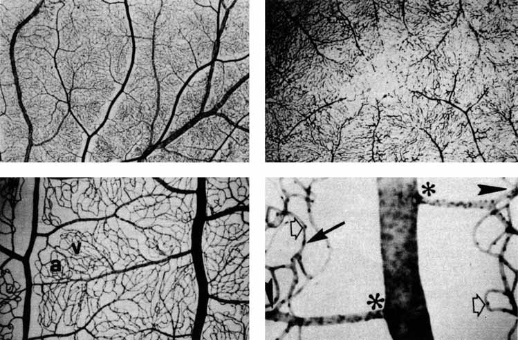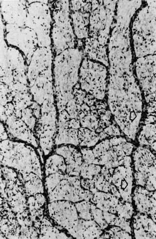The termination of the capillary beds at the border of each of these avascular areas follows a common pattern. At the edge of the capillary-free zone at the fovea, long capillaries link the terminal arterioles and venules to form a delicate circular web of concentrically arranged channels whose width decreases as they approach the edge of this arcade. There are no direct shunts between the arterioles and venules in this or any other terminal area of the retinal circulation. The only normal connection between the inflow and outflow systems is through the capillaries. At the retinal periphery, the capillary bed terminates in an arcade between the arterial and venous system. The major distinction of this region is that the capillaries are more widely separated from each other and are of wider caliber than at the perifoveal arcade. But here, too, there are no shunts between arterioles and venules in the normal eye, and there is a capillary arcade facing the avascular space that surrounds both the arteries and veins. Recent advent of scanning laser Doppler flowmetry has made it possible for retinal blood flow to be quantitated clinically. Volume of blood flow in the nasal retina was significantly lower than that for the temporal retina as a result of smaller retinal vessels and slower blood flow velocity in the nasal retina.249 This was consistent with the higher metabolic demand expected of the temporal retina from its larger size and the presence of the metabolically active fovea. The blood flow through the fovea itself was low because of the presence of the foveal avascular zone.250 The capillary meshwork spreads from the ganglion cell layer through the inner nuclear layer. There are no vessels in the outer plexiform and outer nuclear layers (see Figs. 3 and 47). The exact pattern of distribution of the capillaries in the retina was controversial because of conflicting earlier reported results. With trypsin digest studies, a diffuse arrangement was suggested (see Fig. 48).251,252 In contrast, whole-mount preparations demonstrated that the capillary bed is divided into two distinct laminae throughout most of the posterior retina (Fig. 49).253,254 According to this bilevel schema, the deep capillaries lie in the inner nuclear layer and form a more closely set meshwork than do the superficial capillaries that occupy the nerve fiber and ganglion cell layers. The outer meshwork appears to consist of fine-caliber vessels ranging from 15 to 130 μm in diameter. The superficial capillaries have a slightly wider caliber, ranging from 16 to 150 μm in diameter. The volume of the deep capillary network is relatively constant at different locations of the posterior retina. In contrast, the volume of the superficial capillary network varies dramatically and parallels the thickness of the nerve fiber layer rather than the total retinal thickness.255,256 Thus, in the peripapillary retina the vascularity is the greatest, and up to four different capillary layers are identifiable, even though the retinal thickness is comparable to that of the parafoveal crest (Fig. 50). In contrast, in the perifoveal region and at the ora serrata, the capillary network thins to a single layer. In the peripapillary region, this unique lamina of capillaries in the superficial portion of the nerve fiber layer originates from intraretinal precapillary arterioles and drains into retinal venules and veins lying on the optic nerve head.257 These capillaries have a long straight or slightly curved path fanning out over the nerve fiber layer within two disc diameters of the papilla and are the most prominent in the superior and inferior temporal quadrants of the peripapillary zone. This peripapillary radial capillary bed is unique among retinal capillaries in its lack of anastomoses with other capillaries, infrequent arterial input, and unusually great length (over 100 μm). These features make these capillaries especially vulnerable to the effects of elevated intraocular pressure and changes in retinal perfusion. This anatomic distinction has been invoked to explain the arcuate scotoma in glaucoma, peripapillary flame-shaped hemorrhages associated with hypertension and papilledema, and superficial cotton wool spots associated with retinal ischemia.258,259 The capillary wall is the simplest of the walls of the retinal vessels. It consists of endothelial cells, intramural pericytes (Figs. 51 and 52), and basement membrane. The endothelial cells are so attenuated that their nuclei bulge into the lumen of the capillary. Because the diameter of the lumen of capillaries is small, ranging from 3.5 to 6 μm, the nuclear protrusion causes sufficient distortion that circulating erythrocytes must mold themselves to the luminal contour to pass. The endothelial cells form tight junctions with each other, preventing metabolites from passing freely through the vessel wall. The tight junctions are continuous and are the anatomic basis for the blood–retinal barrier.239 Pinocytic vesicles have been visualized with electron microscopy (see Figs. 51 and 52) and provide the only known significant means for metabolic transfer between the circulation and the retina. Diseases involving the endothelial cells disrupt this normal physiologic barrier and result in exudation of protein and lipid into the surrounding retinal tissue. This breakdown in the blood–retinal barrier is often transient because the endothelial cells can undergo mitosis in response to injury and can form new tight junctions.28 The intramural pericytes reside within the basement membrane of the capillary endothelium (see Fig. 51). They can be seen in cross sections examined by electron microscopy or in stained mounts of trypsin digest examined by light microscopy.260 The nuclei of the intramural pericytes are darker and more spherical than those of the endothelial cells. They bulge externally toward the surrounding glia. The cell contour, shown by special staining or by retinal diges
