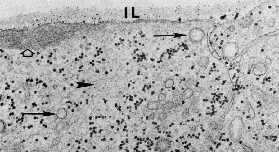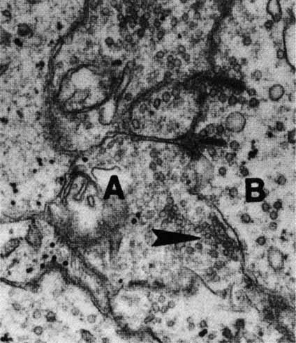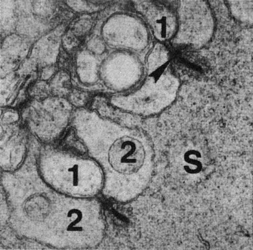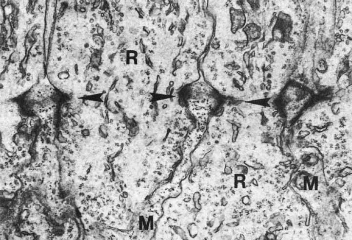 The basic feature of the presynaptic elements of the chemical synapse is the boutons terminaux at the ends of the axons, or boutons en passant along their length.45 In the central nervous system, these occur at points where myelination has ceased. The lack of myelination in the retina makes it impossible to use myelination gaps for synapse identification. Although most synapses are axodendritic, axosomatic, or axoaxonal, other types have been documented in the brain and the retina where the presynaptic component is not axonal but dendritic or somatic. However, all of these synaptic types share a common morphology consisting of presynaptic and postsynaptic membranes, the densities associated with their cytoplasmic faces, and the synaptic cleft between them. In the retina, three different classes of chemical synapses have been described based on the appearance of the presynaptic element: conventional synapse, ribbon synapse, and flat or basal junction.66 The conventional synapse, which is similar in morphology to other chemical synapses found throughout the vertebrate nervous system, has aggregates of synaptic vesicles clustered close to the presynaptic membrane. These vesicles are membrane-bound organelles that contain neurotransmitter substances and enzymes involved in neurotransmitter metabolism.67 They lie in the midst of a hexagonal array of electron-dense particles, each 30- to 50-nm wide and separated from neighboring particles by an interval of 20 to 50 nm.68 This electron-dense material is believed to play a role in the attachment of the synaptic vesicles to the presynaptic membrane. These synapses are found in the presynaptic terminals of horizontal cells, amacrine cells, and interplexiform cells.66 They typically have an inhibitory effect in the postsynaptic neuron. The ribbon or invaginating synapse, in contrast, is usually found in the presynaptic terminals of photoreceptors and bipolar cells in the retina (Fig. 20). They are also often observed throughout the invertebrate nervous system. The presynaptic terminal of the ribbon synapse is characterized by the presence of an electron-dense bar or a ribbon of approximately 1 um length that is oriented perpendicular to the presynaptic membrane. Reconstruction reveals that this ribbon is in fact a rectangular or horseshoe shaped plate composed of two osmiophilic electron-dense lamellae flanking an electron-dense central layer69,70 This synaptic ribbon is surrounded by a precisely arranged array of synaptic vesicles and appears to be anchored to the presynaptic membrane by three to five delicate electron-dense filaments. The shape and size of the synaptic ribbons can change depending on the maturation stage, activity state of the synapse, or light/dark cycle. Although the precise function of the synaptic ribbon is unknown, it has been hypothesized to function as a “conveyor belt” to channel synaptic vesicles to the presynaptic membrane for neurotransmitter release, to immobilize the vesicles in inactive synapses, storage device for synaptic transmitter, and to act as a diffusion barrier for presynaptic ions.69 In the inner plexiform layer, this synapse has two postsynaptic processes, forming a “dyad.” In the outer plexiform layer, there are three postsynaptic processes, forming a “triad” (see Fig. 20). Basal junctions are found in the presynaptic terminal of photoreceptors only.66 In the mammalian retina, these junctions are found only in association with cone cells. Typically, the presynaptic membrane is smoothly indented, and there is prominent electron-dense material on the inner surface of the terminal membrane. However, no synaptic vesicle is seen in association with the electron-dense material. The exact mechanism for chemical transmission through these synapses is unclear. However, in axonal terminals of goldfish horizontal cells in which no presynaptic vesicles are found, neurotransmitter release is believed to occur by a carrier-mediated mechanism.71 Such a process may be involved in basal junctions of mammalian photoreceptors. The involvement of a neurotransmitter in signal transduction is implicated by freeze-fracture studies that show that the postsynaptic membranes of these synapses contain particles that are similar to those found in the postsynaptic membranes of these synapses contain particles that are similar to those found in the postsynaptic membranes of a conventional synapse in the brain. The synaptic cleft of a typical chemical synapse is 20- to 30-nm wide.45 It is not a free space because it houses material that binds the presynaptic and postsynaptic membranes together in a strong adhesion. The electron-dense plaque in the middle of the synaptic space contains mucopolysaccharides and proteins, which may serve to maintain the attachment between the presynaptic and postsynaptic membranes through a form of polyionic binding. Filaments composed of macromolecules span the synaptic cleft. This synaptic cleft substance may be important for formation, localization, and proper function of the synapse. Macromolecules spanning the gap between the presynaptic and postsynaptic membranes may ensure rapid transport of the transmitter molecule through the cleft and may prevent the transmitter from diffusing away from the synapse.72 In the postsynaptic membrane, a linear density is present. From this structure, filaments project out toward the cytoplasm.45 These densities form either a single large or several small discs, which may be interspersed with puncta adhaerentia. The anatomic location of the receptors for the transmitter molecule in the postsynaptic membrane has not yet been determined. However, freeze-fracture studies have shown minute bumps within the specialized zone of the postsynaptic membrane that may represent the neurotransmitter receptor molecule.66 In the case of the neuromuscular junction, alpha-bungarotoxins that bind to the acetylcholine receptor have been localized in the regions of the posts