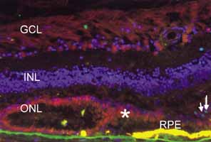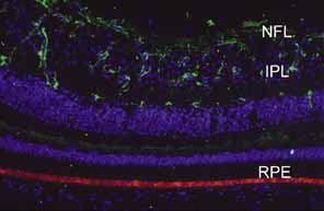 | The cells within the retina can be divided into neuronal, glial, and vascular components. The neuronal cells are responsible for the primary function of the retina (i.e., conversion and transmission of incoming light into an electrical signal perceived by the brain). This is achieved through intricate synaptic connections among three different classes of retinal neurons, namely, photoreceptors, interneurons, and ganglion cells. A detailed understanding of the cellular morphology of these neuronal cells and their synaptic connections has been possible in recent years with the advent of electron microscopy, immunohistochemistry, and Golgi-impregnated preparations. Morphologically, 55 different types of retinal neurons have been identified in the mammalian retina to date. The function of 22 of these cell types is known. Each morphological type of retinal neuron appears to have a distinct physiological function. As further studies improve our understanding of the retina's role in processing the visual signal, the function of the remaining identified cell types will become apparent. |