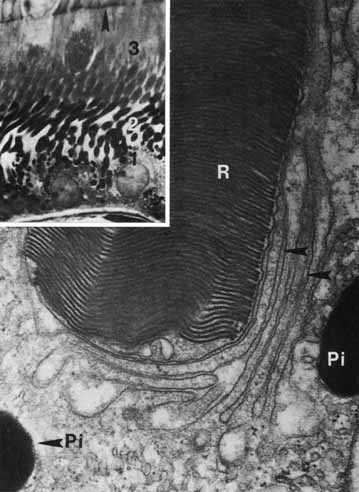 The Müller cells, unlike the photoreceptors, do contact each other and, in these locations, form contiguous membrane densities, zonulae adherentes. The function of this line of junctions remains speculative. It is thought to act as a barrier to diffusion of materials between the intercellular space of the inner retina and the extracellular matrix between the photoreceptor outer segments and pigment epithelial microvilli. Synaptic Areas The connection between the photoreceptors and the bipolar cells is different in rods and cones.66 The rod terminates in an expansion designated a “spherule,” whereas the cone feet are the “pedicles” (see Figs. 20 and 25). In the fovea, there are none of these terminals, because cone pedicles are displaced laterally to the extrafoveal region. The rod spherules may be round or oval, with a diameter of approximately 1 μm. They are deeply indented by bipolar and horizontal cell processes, which in turn are embraced by the plasma membrane of the spherule (see Fig. 20). Within this membranous entanglement is an area modified to be a synapse. The membranes of the synapse have the characteristic electron-dense appearance and are thicker than the remainder of the cell membrane away from the synapse. The spherules are filled with clear synaptic vesicles, mitochondria, and neurotubules that enter from the rod axon. The vesicles in the spherules and pedicles are similar to those in all synapses in the central nervous system.66 They are presumed to contain the neurotransmitter for signal transmission from the photoreceptors to the bipolar and horizontal cells. This transmission process also occurs between photoreceptor cells, as indicated by the extension of the spherules to share synapses with terminations from adjacent or nearby rods. Such spherules receive many processes, usually more than five. There are two types of processes that penetrate the spherules: teledendrite of the horizontal cells, which enter deeply, and bipolar cell dendrites, which have a more shallow penetration. Although each horizontal cell contacts a spherule only once, each spherule may be contacted by the processes of several horizontal cells (Table 2). Each spherule synapses with one to four bipolar cells, each at separate points of contact within the spherule. Each bipolar cell, in turn, contacts at least 50 rods outside the perifoveal region.108 More peripherally, the bipolar cells increase their connections to hundreds of rods. This change corresponds to decreasing visual discriminatory ability toward the periphery. The function of the horizontal cell is to spread light excitation, received at a given point of the retina, over a large portion of the connections in the outer plexiform layer. Data from multiple sources.87,89,119,122