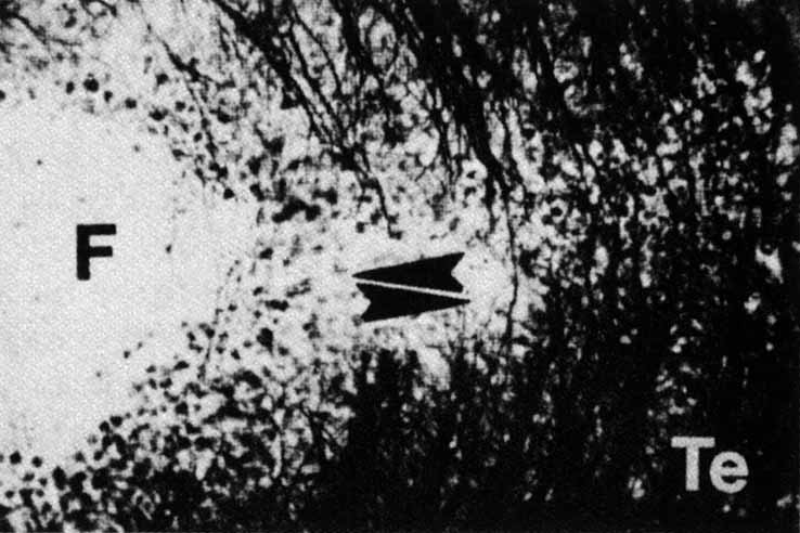 in function. The synaptic junction of a typical chemical synapse consists of specialized apposed membranes of the two neuronal cells, separated by a 20- to 30-mm cleft.45 Similar to other intercellular junctions, such as zonulae adherentes, the plasma membrane of the synaptic junction contains tufts of fine filaments that insert into cytoplasmic densities, and the two apposing cell membranes are glued together by a thin, dark plate of filamentous material in the intercellular cleft.46 However, unlike the interepithelial cell adherence, the interneuronal synapse is polarized and has an asymmetric predominance of intracytoplasmic fibrils in the postsynaptic side of the junction. The distinction between the morphology of the synaptic junction and that of the zonula adherens is important because both types of junctions are present between neuronal cells in the retina. These nonsynaptic junctions do not serve the purpose of electrical communication between cells. As in epithelial tissue, where they are commonly found, the zonulae adherentes act as binding sites to maintain tissue cohesion.45 In neural tissue they are usually short and have been given the special label puncta adhaerentia.46 Another type of junction between neuronal cells in the retina is the gap junction.47 In a gap junction, there is close apposition between presynaptic and postsynaptic membranes, and current is allowed to pass directly between adjacent cells. Thus, it is classified as an electrical synapse. Because no chemical mediator substance is involved, the rate of signal transmission is faster in these junctions than in typical chemical synapses. In some synapses, characteristics of both the chemical synapse and the gap junction are found. These connections, called “mixed synapses,” have not been found in the retina thus far.45 The electrical synapse (gap junction) characteristically shows a transsynaptic gap with a seven-layered structure produced by the approximation of membranes from the two juxtaposed cells (Fig. 19).48 The synapse consists of four dense lines and three intervening light spaces. It lacks the morphologic detail characteristic of the chemical synapse. Thus, they are localized best by tracer coupling. There are no vesicles and no obvious changes in the cytoplasm on the two sides of the junction. The gap junction does not function by the use of a chemical transmitter. Instead, it offers a low-resistance pathway between the cells. The extent of the electrical coupling of the adjacent cells appears to be dependent on the level of expression and type of the connecting particles (connexin). Thus, plasticity of the coupling in the retina is possible and the retina has the potential to optimize vision for the ambient lighting conditions.49