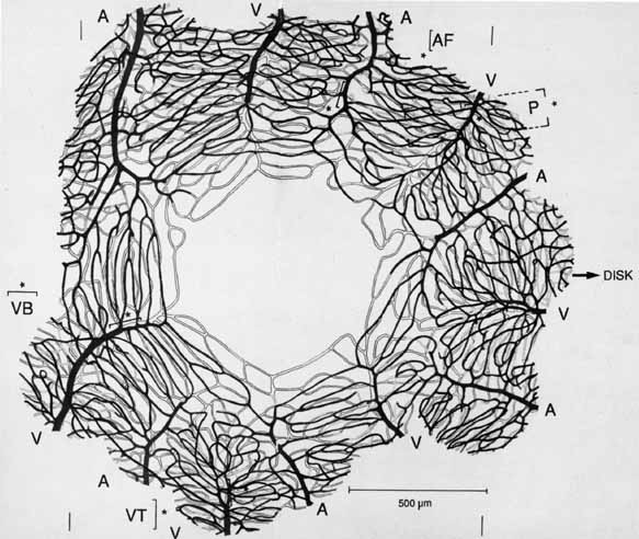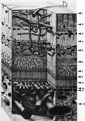 primary photoreceptor tissue of the eye. With the technical advancement in alcohol tissue fixation, Treviranus first performed the detailed microscopic studies of retinal anatomy in 1835. The later development of thin tissue sections and staining techniques allowed the study of complete neurons and the development of a tentative understanding of the neuronal cell polarity and wiring. The recent use of electron microscopy, immunohistochemistry, and single-cell electrophysiologic studies furthered our understanding of the intraretinal cellular connections and ultrastructure and their role in the complex electrical processing of visual information. New clinical imaging techniques, such as optical coherence tomography, allow us to examine retinal histology in vivo, thus advancing our understanding of pathogenesis of various retinal disorders. The first detailed study of the anatomy of the retinal vasculature was possible with the advent of the trypsin digest technique. This provided an initial framework for the understanding of retinal vascular physiology. More detailed understanding of the retinal vasculature has been possible recently with progress in whole-mount tissue preparations. Clinical use of fluorescein angiography and newer techniques of vascular flow measurements, e.g., scanning laser Doppler flowmetry, have made possible the correlation between in vivo physiologic vascular changes and previously observed histologic changes in various pathologic entities. This intimate relationship between the development of concepts of retinal structure and function is no accident. Discoveries in each of these areas have been the basis for further investigation into the other. This chapter is an overview of our current understanding of the retinal anatomy, at both gross and microscopic levels. When appropriate, anatomic correlation is made with various physiologic and pathologic retinal processes. |
