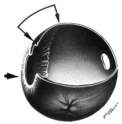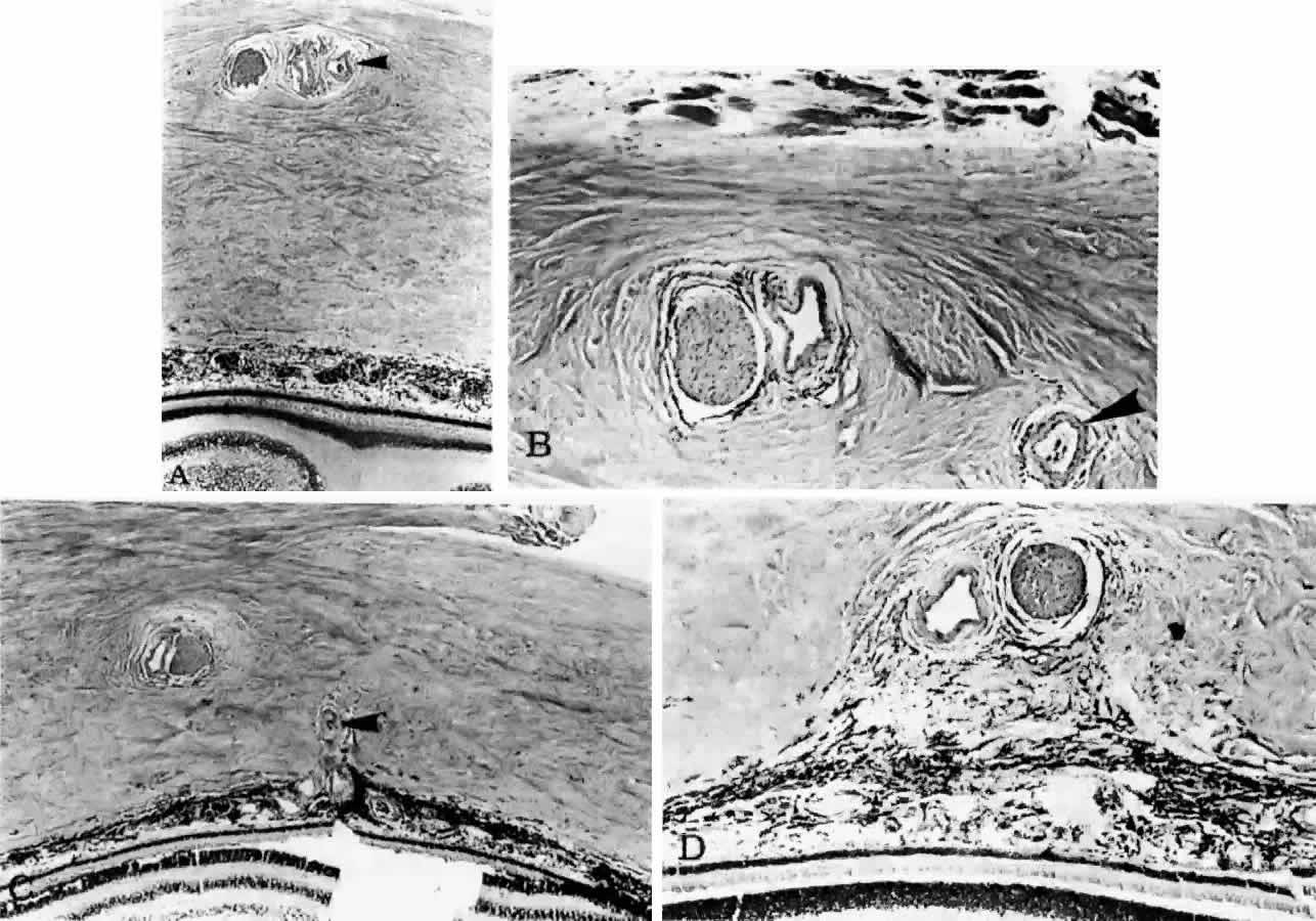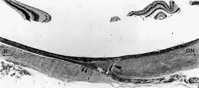 Heimann,6 however, was able to identify arteries as two-layered, narrow vessels and veins as tubes with wide lumina and a single layer of endothelium by the end of the second month. At first, the endothelium-lined tubes are concentrated inferiorly and distally. With invagination of the optic vesicle, pigment appears in the outer layer of the optic cup. Melanin first appears in the RPE between gestational weeks 5 and 7.1,2,4,7 Pigmentation is linked to capillary formation, as primitive capillaries develop from the plexus external to the pigmented areas. The subjacent choroid and sclera never form correctly if the RPE fails to develop, as happens in colobomas (Fig. 7). The capillaries completely invest the optic cup, but they are separated from it by the basement membrane of the RPE at the 13-mm embryonic stage.1,4,8–10 The RPE basement membrane, the first layer of Bruch's membrane to form, is definitely present by week 7, and it is probably present earlier.7,9,10 The basement membrane of the capillaries appears at week 9, and collagen is interposed between the two basement membranes by week 12.1,2,7,9,10 In this period, fibroblasts are found between the capillaries and the RPE and probably produce the collagen fibers and matrix of Bruch's membrane. The elastic layer of Bruch's membrane appears late.9,10 In a comparative study of the histogenesis of Bruch's membrane in commonly used laboratory mammalian animals (e.g., hamster, vole, rat, rabbit, ferret, cat), Greiner and Weidman11 found that the first layer of Bruch's membrane to develop was the basement membrane of the RPE, followed by the collagenous layer. Subsequently, the basement membrane of the choriocapillaris appeared. Finally, the development of the elastic tissue layer divided the collagenous layer into thicker inner and thinner outer layers. This study of the histogenesis of Bruch's membrane in mammals differs from the previously accepted development of Bruch's membrane in human embryos in that it showed that the collagenous layer is formed before the appearance of the endothelial basement membrane from the choriocapillaris. Arterial branches of the ophthalmic artery and the posterior ciliary arteries pass perpendicularly into the layer of the choriocapillaris by the second month. The short ciliary arteries pierce the developing scleral coat by the third month and join the capillaries in the posterior third of the choroid, and the long ciliary arteries terminate in the region of the ciliary body. Wider capillary channels merge to form larger vessels, which in turn join to form the vortex veins. Meridionally directed capillaries are gradually shifted outward into the choroid proper and become medium-sized veins in the fourth to sixth months. Other capillaries fill the area internal to these displaced vessels. The changes progress from posterior to anterior, and the capillaries reach their final position at the posterior ciliary body during late gestation. The anterior ciliary arteries form in the fourth month and join the iris circle together with the long posterior ciliary arteries, although recurrent branches from the major arterial circle appear in the sixth to ninth months.6 Numerous interarterial anastomoses are found in the fetal choroid; these can be seen in young adults, although the number is decreased.6 The submacular branches of the short posterior ciliary arteries have a different configuration from that of the other short ciliary arteries. The submacular arterioles extend in several directions like a fan; they are not radial like the other short posterior ciliary arteries.6 The origin of choroidal melanocytes and stroma has been ascribed to both the mesoderm2,4,8 and cranial neural crest cells.1,3,4,12 Experimental work using labeled cranial neural crest cells in amphibians, chicks, and rats has established that, with the exception of the vascular endothelium and the RPE basement membrane of Bruch's membrane, all of the choroid—including the vascular smooth muscle cells, stromal fibrocytes, and melanocytes—is derived from cranial neural crest cells.5,12-15 During closure of the neural tube, the crest cells migrate in waves and surround the optic vesicle with a luxuriant layer of undifferentiated mesenchymal cells. Choroidal melanocytes and stroma are established from these cells.5,12,13 Melanin first appears in peripapillary melanocytes between weeks 24 and 27, and melanization proceeds anteriorly and is complete at birth.7 The choroidal stroma is highly nucleated at birth, and with continued growth of the globe, the nuclear density decreases.2,8 Extramedullary hematopoiesis occurs in the choroid, and nucleated cells are frequently found in premature infants and occasionally in term infants. |