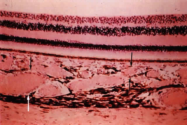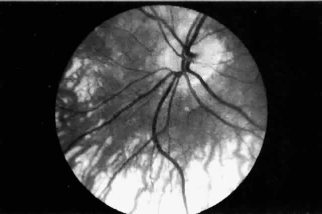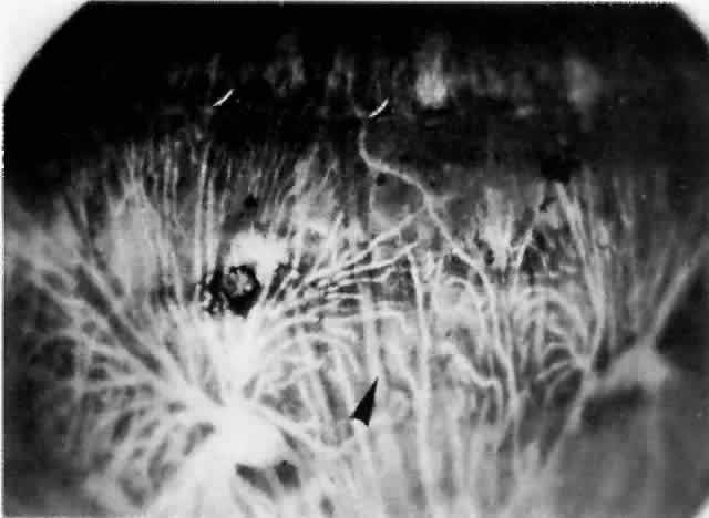 Amalric69 divided the clinical situations in which choroidal triangles occurred into three groups: (1) generalized or systemic vascular processes; (2) localized circulatory obliterations; and (3) choroidal arteriosclerosis. Clinical entities such as malignant hypertension, chronic renal failure, toxemia of pregnancy, collagen vascular diseases (e.g., scleroderma, systemic lupus erythematosus, Raynaud's phenomenon), and vasculitis (e.g., temporal arteritis) are included under the rubric of generalized or systemic vascular processes. Also included are hemorrhage leading to hemorrhagic shock, and hematologic diseases such as polycythemia vera, disseminated intravascular coagulopathy, thrombotic thrombocytopenic purpura, and cryoglobulinemia. Localized circulatory obliterations refer to thromboembolic events and to ischemia resulting from entities such as trauma, infection, or degenerative disease states. Choroidal arteriosclerosis has been related to changes brought on by diabetes and aging. Foulds and co-workers70 presented cases of cranial arteritis documented clinically or clinicopathologically, in which wedge-shaped (triangular) areas of acute retinal edema were associated with visual loss. Recovery of vision occurred with the resolution of the retinal edema and the appearance of pigment clumping in a triangular distribution. The clinical features of these cases were consistent with obstruction of a major branch of one of the short posterior ciliary arteries. Some of their cases of choroidal ischemia showed evidence of choroidal and optic nerve changes. Adjunct studies (hue discrimination and electro-oculography) supported the etiology of outer retinal injury instead of a primary optic neuropathy. Because the optic nerve head is supplied by the short posterior ciliary arteries, as is the choroid, the findings of disturbances in the choroidal flow and optic nerve ischemia could be explained readily. In an attempt to determine whether visual loss in cases of ischemic optic neuropathy could be attributable to retinal damage due to choroidal ischemia as opposed to primary optic nerve damage, Foulds and colleagues70 retrospectively studied 22 cases of ischemic optic neuropathy. Only 4 of the 18 available fluorescein angiograms reviewed showed disturbed choroidal filling and patchy choroidal leakage in addition to the expected leakage at the optic nerve head. Interestingly, of seven interpretable tests of hue discrimination, six were suggestive of choroidal blood-flow disturbances. The fluorescein studies showed that acute disturbances of choroidal blood flow are not common in patients with ischemic optic neuropathy, whereas color-vision testing supported the concept that the visual disturbances occurring in patients with ischemic optic neuropathy arose from choroidal vascular lesions rather than a defect in optic nerve conduction. The authors concluded that choroidal blood-flow disturbances probably play a role in the symptomatology of ischemic optic neuropathy. Funduscopic changes in the retina resulting from malignant hypertension are well characterized and include arteriolar constriction, papilledema, retinal detachment, retinal hemorrhages, and cotton wool spots (i.e., nerve fiber layer infarcts). The retinal findings of malignant hypertension tend to overshadow the acute vaso-occlusive choroidal lesions that often accompany systemic hypertension and play a role in the pathogenesis of retinal detachment. In evaluating the role of acute ischemic infarcts of the choroid in retinal detachment associated with systemic hypertension, Klien71 described the following histologic changes in the choroid: