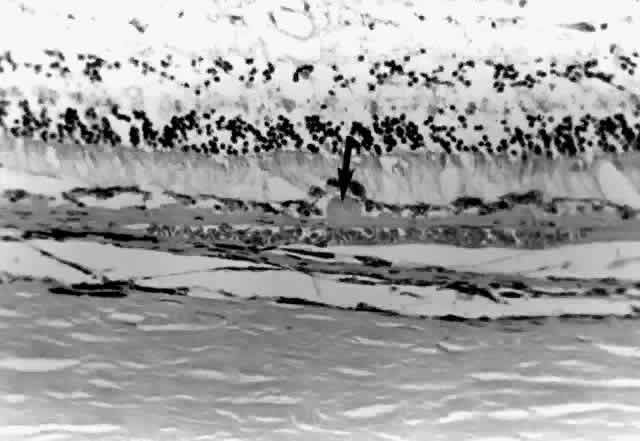 The uvea has a spherical shape containing two round openings. The anterior opening, the pupil, is bordered by the iris. The pupil diameter varies from 1 to 8 mm. The iris leaflet is bathed in aqueous humor and separates the anterior compartment into anterior and posterior chambers. The size and character of melanocyte pigment granules determines the iris color. The ciliary body lies between the iris and the choroid, functions during accommodation, and produces the aqueous humor. The iris joins the ciliary body near the recess of the anterior chamber angle. The anterior portion of the ciliary body is the pars plicata. The posterior portion of the ciliary body, the pars plana, merges with the choroid at the ora serrata. The choroid extends posteriorly from the ciliary body without interruption to the posterior opening of the uveal tract, the canal for the optic nerve. The optic canal is surrounded by the choroid and subjacent sclera. The uvea is firmly attached to the sclera at three sites: (1) anteriorly at the scleral spur; (2) at the exit of the vortex veins; and (3) posteriorly at the optic nerve. Potential spaces are present between the ciliary body and the sclera and between the choroid and the sclera. These contiguous potential spaces are called the supraciliary and suprachoroidal spaces, respectively. Internally, the entire uvea is lined by two continuous layers derived from the neuroectoderm. These layers serve distinct specialized functions in the three subdivisions of the uvea. The layers are described in segments as the anterior and posterior pigmented epithelium of the iris; the inner nonpigmented and outer pigmented ciliary body epithelium; and the inner neurosensory retina and the subjacent retinal pigment epithelium (RPE) (Fig. 2). The outer epithelial layer is separated from the underlying uvea by a continuous basement membrane. The remainder of this chapter will deal with the posterior uvea, the choroid. |