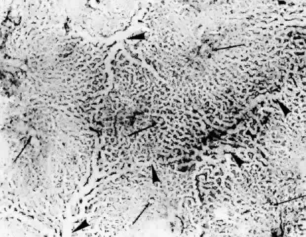 Choriocapillaris There is disagreement in the literature regarding the appearance and organization of the choroidal vasculature, particularly of the choriocapillaris, in different areas of the globe (i.e., the posterior pole, equator, and periphery).27,30,36–40 Despite the controversy regarding the angioarchitecture of the choriocapillaris, one fact is evident: There is great variation in the choroidal pattern within different areas of the same eye and in eyes from different individuals. This variation may explain some of the disagreement and inconsistencies regarding the choroidal circulation. In general, the choriocapillaris appears as a single layer of broad, wide capillaries lying in a plane internal to the arteries and veins of the choroid and external to Bruch's membrane. The capillaries of the choriocapillaris measure 20 to 50 μm in diameter. The density of the capillaries is greatest in the posterior choroid.28 The capillaries of the choriocapillaris appear as a continuous meshwork or reticulation, with intervascular spaces denoted as columns or septa. The choriocapillaris supplies oxygen and nutrients to Bruch's membrane and the outer third of the retina, except in the macula, where it supplies the entire retina. It is slightly flattened under Bruch's membrane, providing a large surface area for metabolic exchange, whereas the external floor (scleral surface) of the capillaries is gently undulating. Arterioles and venules join the choriocapillaris from the external surface, either perpendicularly or obliquely, or they come to lie in the same plane of the choriocapillaris and join the capillaries directly or at right angles. A focus of the controversy regarding the choroidal circulation is the organization of the choriocapillaris layer. Currently, the widely accepted concept of the choriocapillaris circulation and anatomy is based on work first presented in the early 1970s. Based on observations of fluorescein angiograms in monkeys, Hayreh41–43 described the choriocapillaris as a homogeneous, lobular structure with a centrally located feeding arteriole and peripherally located collecting venules. Noting that fluorescence did not cross lobular borders, he concluded that the choriocapillaris had a segmental distribution and that choroidal arteries behaved as end-arteries. Weiter and Ernest30 described the anatomy of the choroidal vasculature using vascular casts injected with neoprene latex. By observing the vascular filling, they were able to distinguish between precapillary arterioles and venules. They found that the choriocapillaris was thickest and of greatest density in the submacular region. The choriocapillaris in the peripheral choroid was found to have a specific pattern in which a precapillary arteriole supplied a circular capillary area 1 to 2 mm in diameter. Venule drainage separated contiguous circular capillary beds, possibly resulting in effective end-arteries despite the fact that adjacent capillary beds were interconnected. This distinct choriocapillaris pattern was not evident in the equatorial and posterior choroid, where many precapillary arterioles were directly interconnected via the choriocapillaris without intervening venule drainage. Torczynski and Tso27 reported on the architecture of the choriocapillaris in the posterior pole after examining choroidal flat preparations and transverse and oblique histologic sections (Figs. 21, 22, and 23). They described the overall appearance of the posterior choriocapillaris as a series of adjoining lobules that was striking in some preparations and subtle in others. The center of the lobule consisted of a single precapillary arteriole rimmed in a thick mantle of collagen measuring 15 to 25 μm and opening perpendicularly or curvilinearly into a capillary bed that radiated an average distance of 300 to 400 μm before changing from a radial to a circumferential direction. The circumferential capillaries in the periphery of the lobule were wider and converged from several directions, forming star-like or dendritiform configurations in the plane of the choriocapillaris. Venular openings, outward bulgings of the external choriocapillaris called atria, measured 30 to 37.5 μm and were present singly and in linear sequences underlying the circumferential capillaries. The often incomplete lobules varied in their geometric configuration, having three to six sides and ranging in area from 420 × 605 μm to 800 × 1200 μm. The lobular unit was thought to provide a preferred outflow route via the perimeter of postcapillary venules so that cross-flow from lobule to lobule would not normally occur, and thus the precapillary arteriole would function as an end-arteriole.