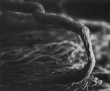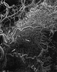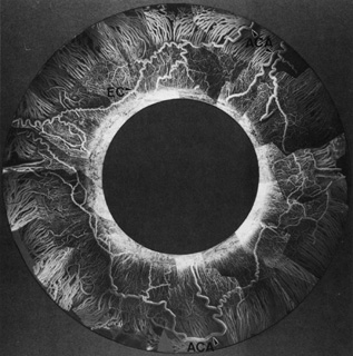 The irregularly shaped endothelial cells have a cytoplasm with mitochondria, rough-surfaced endoplasmic reticulum, smooth-surfaced endoplasmic reticulum, Golgi apparatus, and pinocytotic vesicles. Endothelial cells interconnect through thin areas of more or less tortuous interendothelial clefts composed of adjacent cell membranes. The basement membrane, which is almost parallel to the outer contour of the endothelial cells, consists of one to several dense layers with a less dense zone filling the space between them. Pericytes are attached to the basement membrane, often with one or more dense zones between them and the endothelial cell; their cytoplasm contains endoplasmic reticulum, mitochondria, Golgi apparatus, pinocytotic vesicles, and fine filaments. No smooth muscle cells are found. Bundles of collagen fibrils adjacent to the vessel walls merge into the surrounding connective tissue. Episcleral and conjunctival vessels are permeable to tracers such as fluorescein-labeled dextrans of different molecular weight or horseradish peroxidase injected into the blood stream or into the anterior chamber39,40; tracers escape from the vessel lumen by crossing the thin interendothelial clefts. It can equally be expected that the aqueous humor that reaches the episcleral and conjunctival vessels through the canal of Schlemm and collector channels can freely diffuse into the episcleral loose connective tissues and the subconjunctival spaces across the walls of these permeable vessels. Episcleral and conjunctival vessels are not permeable to indocyanin green because this molecule binds 98% of the plasma proteins.27 |