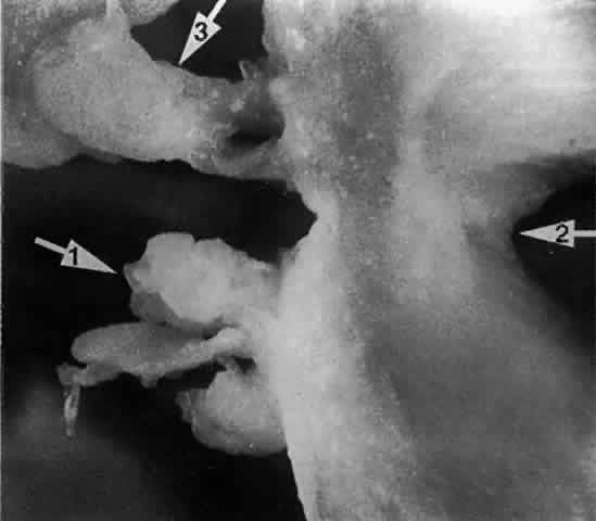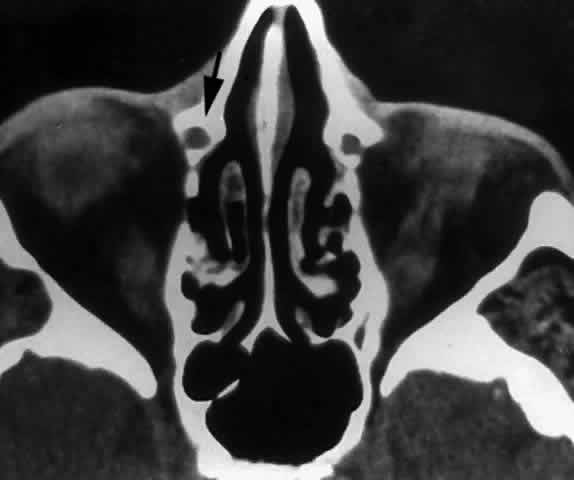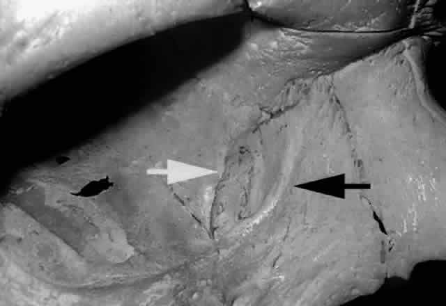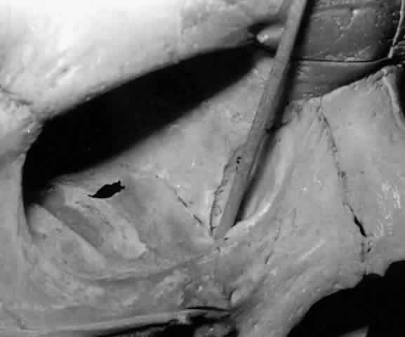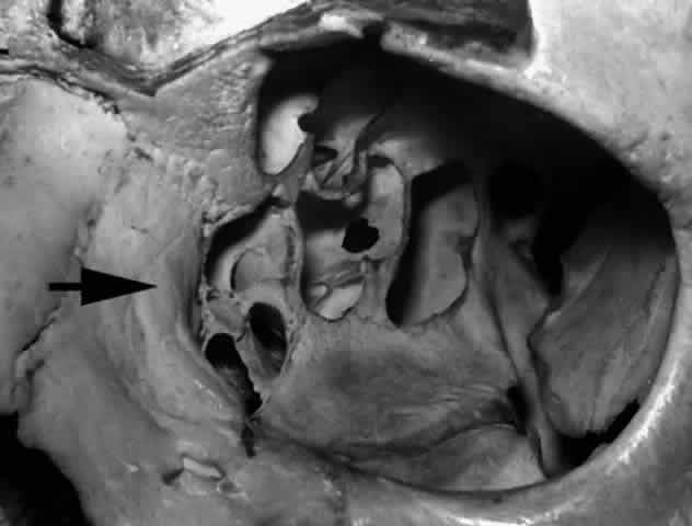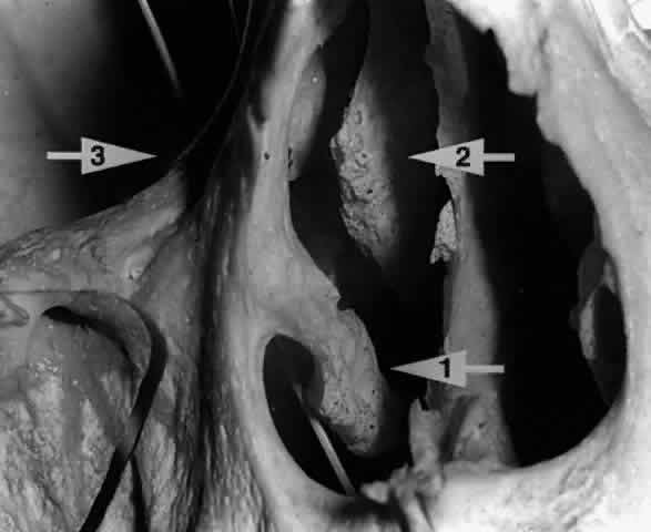 The nasolacrimal canal is seen in relief (Fig. 31) on the medial wall of the maxillary sinus and sometimes on the lateral wall of the middle meatus of the nose. In the usual circumstance where the maxillary bone provides the major contribution to the nasolacrimal canal, the elevation is greater on the maxillary sinus side.