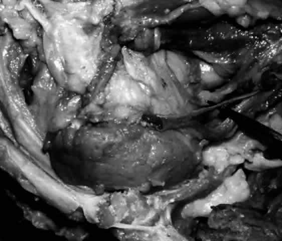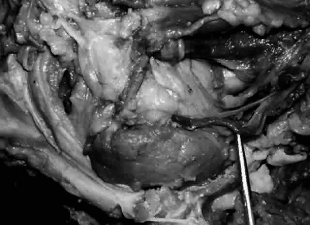main lacrimal gland; and (2) the accessory lacrimal glands. GROSS ANATOMY OF THE SECRETORY SYSTEM The Main Lacrimal Gland The main lacrimal gland resides in the superotemporal orbit, partially within a shallow bony fossa in the lateral angular process of the frontal bone (fossa glandula lacrimalis). The gland is situated between the eyeball below and the curved orbital wall above, giving it a somewhat compressed and curved shape. It may extend inferiorly to the lateral canthal tendon. The lateral horn of the levator aponeurosis crosses the gland anteriorly, separating it into a larger superior or orbital lobe and a smaller inferior or palpebral lobe (Fig. 2). The division is incomplete because the larger orbital lobe is connected to the smaller palpebral lobe posteriorly by a bridge of glandular tissue, draining tubules, and Müller's muscle, which is attached to the underside of the levator muscle and aponeurosis. The lacrimal gland is surrounded by fibrous tissue that is attached superiorly to the periosteum of the frontal bone and inferiorly to the orbital portion of the zygomatic bone.1 These attachments may become attenuated in older persons, allowing the gland to herniate through a weakened orbital septum to give a temporal bulge in the upper eyelid (Fig. 3). The lacrimal gland tissue is usually grayer and pinker than the surrounding yellow adipose tissue. The almond-shaped orbital lobe (see Fig. 2) represents approximately 65% to 75% of the gland and measures 20 mm long × 5 mm thick × 12 mm wide.2 Its sharp anterior border rests behind the superior orbital rim and is covered by the orbital septum (Fig. 4) and a portion of the temporal aspect of the central preaponeurotic fat pad (Fig. 5). Posteriorly, its rounded border is supported by a large superotemporal fat pad at the plane of the posterior pole of the globe.3 The convex superior surface is suspended from the periorbita of the lacrimal gland fossa of the frontal bone. The inferior border is convex and attached to the sheath of the levator aponeurosis. Its lateral border is smooth and convex in contour with the bony fossa.