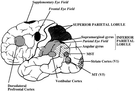 to be tested by future studies. THE SACCADIC SYSTEM Multiple Roles for Saccades Rapid eye movements serve several distinct purposes.1,143 First, fast phases of nystagmus reset the eyes following vestibular or optokinetic slow-phase movements. Second, spontaneous saccades, at a frequency of about 20 per minute, allow visual search, although they also occur in darkness. Third, reflexive saccades are made in response to new visual, auditory, or tactile cues at short latency. Fourth, voluntary saccades point the eyes at a predetermined location or goal. Voluntary saccades can be made in a predictive fashion if a visual target is moving in a regular pattern: the eye movement anticipates the target jump. Voluntary saccades can also be made toward remembered or imagined target locations, or in response to verbal commands (e.g., “Look left”"). A special case of voluntary saccades is the antisaccade; the subject is instructed to respond to a visual stimulus by looking to the corresponding position in the opposite visual hemifield. Another test that can be conducted in the laboratory setting is to ask subjects to make saccades to the remembered location of a target (a light flashed in darkness) after a delay of several seconds (the memory period). Finally, saccades can be voluntarily suppressed when it is necessary to maintain steady foveal fixation. Although the burst neurons of the PPRF (see above) are ultimately responsible for generating all types of rapid eye movements, different cortical and subcortical areas contribute to programming saccades for different functions. Testing of each type of saccade make it possible to evaluate the separate neural substrates. Cortical Areas that Contribute to Saccade Generation In addition to the frontal eye fields (FEF) and parietal eye fields (PEF), several other cortical areas contribute to the control and programming of saccades (Fig. 4), including the supplementary eye field (SEF); the dorsolateral prefrontal cortex (DLPC), lying on the dorsolateral surface of the frontal lobe, anterior to the FEF, occupying approximately the middle third of the middle frontal gyrus; and the posterior parietal cortex (PPC). What is the flow of information that occurs to program a saccade? After visual inputs reach striate cortex (Brodmann area 17, visual area V1), processing of features such as form, color, spatial location and motion of a viewed object occurs largely separately, in different cortical areas.144 Thus, striate cortex projects to several secondary visual areas, each of which is mainly concerned with analysis of certain features of vision. The inferior parietal lobule is important for the planning of saccades, and in monkeys, contributes to localizing an object in space by taking into account the location of a stimulus within the visual field and the direction in which the eyes are pointing145; in humans, the homologue is probably near to the intraparietal sulcus (posterior parietal cortex [PPC]). In the posterior insula lies one of several representations of vestibular cortex (VC), which contributes information of head or body movements.52 Also important for programming eye movements are the middle temporal (MT, or V5) and medial superior temporal (MST) visual areas,146 which, in humans, probably lie at the junction of temporal, parietal, and occipital lobes.147 In monkeys, area MT contains neurons that encode the speed and direction of moving targets; experimental lesions here cause a selective defect of motion vision and associated tracking defects.146,148 Area MT projects to MST, which contains neurons that combine visual motion information with vestibular and eye movement signals.146,149 Areas MT and MST are important for generating smooth pursuit (see below), and also provide important information to cortical areas concerned with saccade generation because saccades are often made toward moving targets. The PEF in monkeys lies within the intraparietal sulcus, in the lateral intraparietal area (LIP); neurons here discharge before saccades made “reflexively” to visual targets.150 LIP projects to both the frontal eye fields and the superior colliculus, but not directly to the PPRF or riMLF.151 Experimental lesions of LIP delay the initiation of saccades made to visual stimuli.152 In humans, the PEF, which corresponds to the LIP in monkeys, lies in the intraparietal sulcus.143,153 Parietal lesions in humans also cause an increase saccadic latency to visual targets. Unilateral parietal disease may cause bilateral increases in saccadic latency, although the effect is more marked for right hemisphere lesions.154,155 This defect in initiation of saccades often coexists with disorders of hemivisual attention or it may occur alone.154 Parietal lesions impair the accuracy of saccades if the patient is required to respond to two target lights flashed in succession; the second saccade becomes inaccurate.156 In this double-step paradigm, the brain must take account of the location in the visual field of the second target flash (prior to any eye movement) and the size and direction of the final eye movement; both pieces of information must be correct to make an accurate saccade to the remembered location of the second target flash. Thus, PEF seem important for generating saccades to novel visual stimuli. The frontal eye field (FEF) in rhesus monkeys lies along the posterior bank of the arcuate sulcus, corresponding to part of Brodmann area 8. The FEF receives afferents from visual areas MT and MST, dorsolateral prefrontal cortex, PEF, SEF, and from the intralaminar thalamic nuclei. In monkeys, some FEF neurons discharge before volitional but not reflexive saccades. Furthermore, the FEF seem important in suppressing saccades and maintaining steady fixation. In humans, FEF lies in the precentral gyrus and sulcus, close to the intersection with the superior frontal sulcus.153 The FEF project caudally to the superior colliculus, caudate nucleus, and brainstem ret