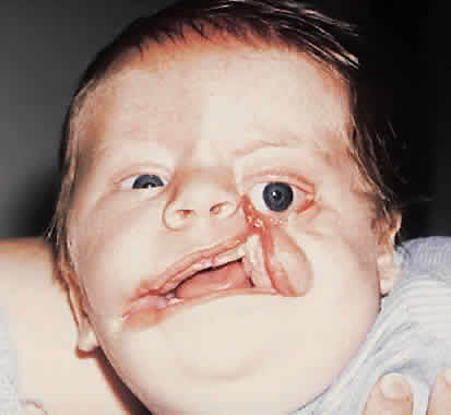 easy to classify. Historically, many attempts have been made to classify the clefting and craniofacial anomalies. Efforts put forth by Morin and coworkers,108 Lund,109 Burian,110 Sanvenero-Rosselli,111 Franceschetti and associates,112 and Karfik113 have enjoyed only brief popularity, as there were numerous shortcomings and overlaps, as well as a poor understanding of the underlying pathogenesis. Paul Tessier, in 1976, presented an orderly classification of the clefting syndromes that has been universally accepted due to its simplification of nomenclature106,113 (Fig. 17). Tessier's system assigns each craniofacial cleft a number from 0 to 14, beginning at 0 in the midline of the lower face and progressing clockwise around the right orbit ending at 14 in the upper facial midline. The left side of the face is organized in the same manner except the designation numbers run counterclockwise. Tessier's classification scheme is purely descriptive and provides no pathogenetic or etiologic information. Nevertheless, this is the most widely accepted system because it facilitates recording and communication among observers.106,113 The morphogenesis of facial clefting is not well understood and is a topic of much debate. To explain the clefting phenomenon, Dursy in 1869114 and His in 1892115 proposed the classic theory of fusion. They suggested that clefts develop as a result of the failure of fusion of the normal embryonic facial processes. In contrast to the classic theory, Johnston116 and Wetson117 subsequently implicated either (1) the failure of neural crest cell migration, which prevents the mesenchyme responsible for skeletal and connective tissue formation of the face or (2) the degeneration of these cells before their migration as the source of clefts. More recently, studies by Vermiej-Keers and coworkers suggests that neural crest cell migration may not be the source of all facial clefting.118,119 the group led by Vermiej-Keers identified four primary sites in embryonic facial development that may lead to facial clefts: (1) between the lateral and medial facial processes, (2) between the lateral nasal and maxillary processes, (3) between the maxillary and mandibular processes, and (4) between the palatine processes.119 These sites are identified as “true clefts” because they are associated with normal sutures of embryologic development. True clefts tend to be well-defined and occur within the seventh week of gestation. Within each of the facial embryonic bony plates there are multiple ossification centers, which vary in location and number, and which arise to complete bone development. Failure of these ossification centers to produce bone may cause bony defects and soft tissue abnormalities forming “pseudoclefts.” These are termed pseudoclefts because they lack association with true facial sutures. Most clefts would thus be considered pseudoclefts using this classification. Clefting phenomena have both genetic and environmental influences. Genetics appears to play only a limited role, the major exception being mandibulofacial dysostosis (Treacher-Collins syndrome), which is transmitted as an autosomal dominant trait and is linked to chromosome 5q31.1-q33.3.120,121 Both trisomy 13 and trisomy 18 are associated with facial clefting at incidences of 40.7% and 6.9%, respectively. Radiation exposure in Japanese survivors of the atomic bombs has been implicated in inducing clefts.122 Following the 1985 earthquake in Santiago, Chile, the rate of facial clefts locally rose from 1.6 to 2.01 per 1000 with a peak incidence 7 months after the quake.123 Infectious agents such as influenza A2 virus and Toxoplasma have been implicated as causative factors as well.124,125 Anticonvulsant drugs taken during pregnancy have been shown to increase the risk of craniofacial clefts six times over the risk of children born to mothers without seizure disorders.126 Maternal use of cocaine and benzodiazepines has also been reported to be associated with cleft lip, cleft palate, and atypical facial clefts.127 Dilantin, corticosteroids, and retinoids have also induced clefting in animal models.128 Certainly the variety of potential causal agents identified and the early period of facial embryogenesis, when the mother may be unaware of her pregnancy, creates a situation for unforeseen environmental induction unpreventable by parents. Amniotic band syndrome, which is reviewed in depth later in this chapter, is another cause of clefting phenomenon. Amniotic bands result from ruptures in the amniotic membrane, which then form into tissue chords, which may wrap around or be swallowed by the fetus. These bands lead to facial clefts presumably by causing pressure necrosis. Amniotic bands may actually be the most frequent cause of congenital clefts. REGIONAL CLASSIFICATION OF ORBITAL AND ADENEXAL CLEFTS Fries and Katowitz grouped the orbital clefts into four regional categories that stress the ophthalmic features associated with the clefts4 (Figs. 18 to 21). This system was not intended to replace Tessier's classification but rather to emphasize the clinically involved ophthalmic adnexa affected by these clefts. The four categories, from medial to lateral, are (1) median facial clefts (Tessier's cleft numbers 0,1, 13, 14), which primarily present with hypertelorism; (2) medial canthal and nasolacrimal system clefts (Tessier's cleft numbers 2, 3, 4, 11, 12, and 13), which primarily present with medial canthal dystopia and nasolacrimal abnormalities; (3) central eyelid clefts (Tessier's cleft numbers 4, 5, 6, 9, 10,and 11), which primarily present with colobomatous defects; and (4) lateral canthal clefts (Tessier's cleft numbers 4, 5, 6, 9, 10, and 11), which primarily present with lateral canthal dystopias.