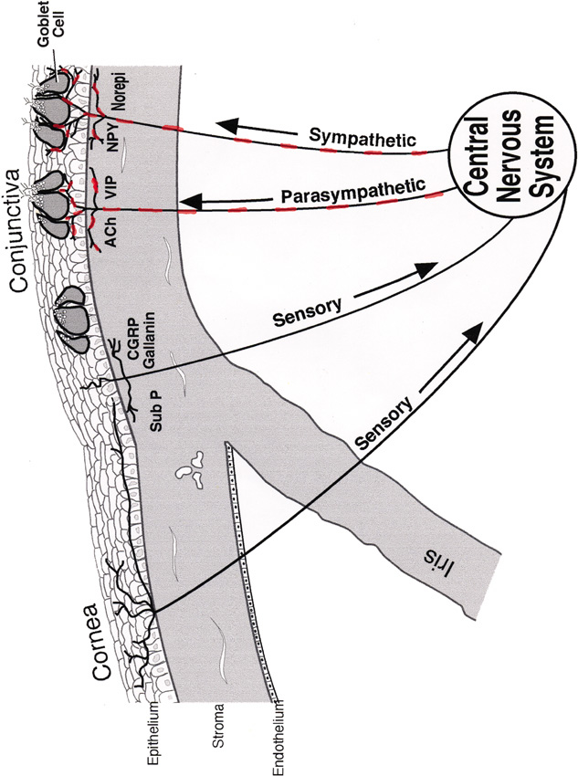 and the aforementioned periorbital structures. The conjunctiva has a rich sensory innervation, but because it lacks muscular structures and innervated glands, no motor nerves are present. Autonomic fibers are present surrounding the blood vessels, and may on occasion supply twigs to scattered and inconsistently present smooth muscle fibers in the plica semilunaris. The sensory nerve supply to the conjunctiva is derived from the first or ophthalmic branch of the trigeminal nerve. This sensory system is closely associated with that of the eyelids, eyebrows, and cornea. The same main functional classes of sensory afferents that have been identified and well-studied in the cornea also innervate the bulbar conjunctiva.29,30 Because the corneal and conjunctival nerves are similar, and because both arise from the trigeminal ganglion, only the characteristics of the corneal nerves are described here. Ocular surface nerves can be classified as thin myelinated (A-δ type) or unmyelinated (C type). These two types of nerves differ in that the former conduct nerve impulses faster than the latter. They also differ in their passive and active electrophysiological properties. All of these peripheral axons lose their myelin sheath when they enter the stroma. They then branch extensively, forming a subepithelial plexus.29 Thin branches derived from this plexus ascend up into the basal layer of the epithelium, where they run parallel to the surface and form leashes that terminate in the apical layers of the epithelium. It is of functional importance that the sensory nerves do not surround the goblet cells but are restricted to the stratified squamous cells. Morphologically, the sensory nerves appear homogeneous: approximately 58% of the sensory nerves contain the neuropeptide CGRP in their nerve endings and axonal fibers, and about 20% contain Substance P.31 Electrophysiologically, these nerves are very different and can be divided into four categories: