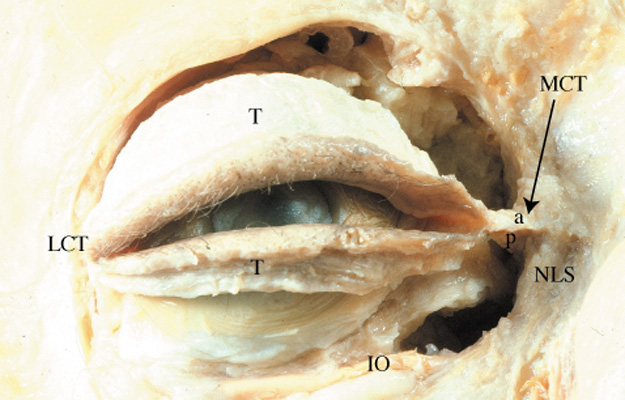 LACRIMAL DRAINAGE SYSTEM Anatomy The lacrimal excretory system begins with a 0.3-mm opening on the medial portion of each eyelid, termed the punctum.3,87 Because of more rapid growth of the maxilla compared with the frontal bone during embryologic development, the lateral migration pulls the inferior canaliculus laterally.88 This results in the lower eyelid punctum to be located approximately 1.0 mm lateral to the upper eyelid punctum.89 Both puncta are directed posteriorly to appose the lacrimal tear lake. Causes such as horizontal eyelid laxity, disinsertion of the inferior retractors from the tarsus, cicatricial shortening of the anterior lamella of the medial eyelid, or trauma may interfere with the precise apposition of the puncta to the lacrimal lake, and thus affect normal functioning of the excretory system. The punctal opening widens into the ampulla, which is 2 mm in height and directed perpendicular to the eyelid margin, before making a sharp turn into the canaliculi. The ampulla, with a diameter of 2 to 3 mm, is the widest part of the proximal drainage system, and thus a common site for formation of dacryoliths. The canaliculi measure 0.5 to 1.0 mm in diameter and run parallel to the eyelid margins. The superior canaliculus is shorter, measuring 8 mm in length, and the inferior canaliculus measures 10 mm (Fig. 6). The canaliculi are lined with 6 to 12 layers of nonkeratinizing, stratified squamous epithelium and surrounded by superficial pretarsal orbicularis oculi muscle as they traverse the medial eyelids and medial canthal region. The deep portion of the pretarsal orbicularis muscle (Horner-Duverney muscle, tensor tarsi, or pars lacrimalis) is important in lacrimal outflow. It passes posterior to the lacrimal sac and the posterior limb of the medial canthal tendon, and inserts onto the upper posterior lacrimal crest.3,87,90 The orbital septum inserts along or just posterior to the inferior posterior lacrimal crest. The deep head of the preseptal orbicularis oculi muscle (Jones' muscle) attaches to the lacrimal sac and lacrimal fascia (Fig. 7).91