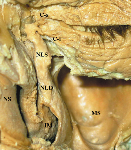 The superior and inferior canaliculi merge to form a common canaliculus before entry into the nasolacrimal sac in more than 90% of individuals.3,92 In a study using digital subtraction dacryocystograms, the common canaliculus was present in 94% of lacrimal drainage systems. The upper and lower canaliculi join at the lacrimal sac wall without a common canaliculus in an additional 4%, with only 2% of systems having completely separate drainage of the upper and lower canaliculi into the lacrimal sac.93 The opening of the common canaliculus into the lacrimal sac is known as the common internal punctum, which should be free of any mucosal membrane or stricture for success of dacryocystorhinostomy surgery. The functional valve between the common canaliculus and the lacrimal sac has traditionally been attributed to the valve of Rosenmüller, although some studies have been unable to document this structure.94 Tucker demonstrated that the canaliculi consistently angle posteriorly en route to the lacrimal sac.95 The canaliculi then bend at the canaliculus-common canaliculus junction at an angle of 118 degrees, before passing anteriorly to enter the lacrimal sac at an acute angle of 58 degrees. This consistent angulation may contribute to a valve-like effect that prevents retrograde flow of tears from the lacrimal sac. The nasolacrimal sac and duct are portions of the same continuous structure. The lacrimal sac is lined by nonciliated columnar epithelium. The total sac measures 12 to 15 mm vertically and 4 to 8 mm anteroposteriorly, although it may be slightly larger in males.91 The fundus of the sac extends 3 to 5 mm above the medial canthal tendon, and the body of the sac measures 10 mm in height (Fig. 6).3 The lacrimal sac is ensheathed in the lacrimal fascia, which refers to the periorbital lining that splits at the posterior lacrimal crest into one layer that lines the fossa, and another layer that encases the lateral sac to reach the anterior lacrimal crest. Between the lacrimal fascia and the lacrimal sac there is a narrow space that contains a fine venous plexus draining into the angular or supraorbital vein.96 In addition, the lacrimal sac is wrapped by the thick anterior and thin posterior limbs of the medial canthal tendon. The structure of the medial canthal tendon has been described as having superior and inferior crura that arise from the tarsal plates. The crura combine to form the medial canthal tendon that then divides into a thicker anterior limb that wraps along the anterior upper half of the lacrimal sac before inserting onto the anterior lacrimal crest, and a very thin posterior limb that passes behind the sac to insert onto the posterior lacrimal crest (Fig. 7). The posterior limb helps maintain the position of the medial canthus in instances of traumatic or surgical disinsertion of the anterior limb. Anatomic dissections have also demonstrated a superior supporting branch of the tendon that courses superiorly to insert onto the frontal bone periosteum at the superomedial orbital rim.97 Below the anterior limb, the inferior portion of the lacrimal sac is bound anteriorly only by the orbital septum, which also inserts onto the anterior lacrimal crest. A distended sac may herniate initially through this thinner inferior septal lining. The sac rests in the lacrimal sac fossa, with its medial aspect tightly adherent to the periosteal lining of the fossa. The lacrimal sac fossa is a depression in the inferomedial orbital rim, formed by the maxillary and lacrimal bones. It is bordered by the anterior lacrimal crest of the maxillary bone, and the posterior lacrimal crest of the lacrimal bone (Fig. 8). The fossa is approximately 16 mm high, 4 to 9 mm wide, and 2 mm deep.87,98 The fossa is widest at its base, where it is confluent with the opening of the nasolacrimal canal. The lower nasolacrimal fossa and the nasolacrimal duct are narrower in females, which may account for the female predominance of nasolacrimal obstruction.99