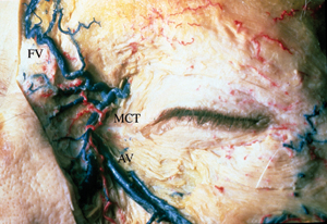 The nasolacrimal duct, measuring 3 to 4 mm in diameter, travels inferolaterally and slightly posteriorly in its bony course to the inferior turbinate for an interosseous distance of 12 mm (Fig. 9). The anterior, lateral, and posterior walls of the canal are formed by the maxillary bone, and the medial wall is formed by the lateral nasal wall and descending process of the lacrimal bone.100 The long axis of the duct and canal forms an angle of 15 to 25 degrees posterior to the frontal plane, or in a line connecting the medial commissure to the first molar tooth.87 The nasolacrimal duct terminates as a 5-mm extension into the inferior nasal meatus on the lateral wall or roof of the inferior meatus. The ostium is located, on average, 25 to 30 mm posterior to the lateral margin of the anterior nares, or 20 mm in children.87,101 When the nasolacrimal duct ostium is obstructed, the duct and sac distend with accumulated fluid. Distention of the intraosseous duct is limited to a diameter of 4 mm because of the rigid bony walls of the canal, with necessary compression of the lymphatic and venous plexi surrounding the duct. The lacrimal sac, in contrast, is not restricted by bone, and may expand laterally and anteriorly. Distention of the sac initially occurs inferiorly, because the medial canthal tendon surrounds the superior half of the sac. The lacrimal drainage system histology transitions from a nonkeratinizing stratified squamous epithelium in the puncta and canaliculi to a dual columnar layer epithelium in the nasolacrimal sac. As the duct approaches the nasal cavity, it gradually shifts to mucoperiosteum with scattered mucus-secreting goblet cells.87 Multiple mucosal folds and sinuses have been reported within the lacrimal drainage system, and they may play a role in regulating tear drainage. The previously mentioned valve of Rosenmüller is located at the junction of the common canaliculus and sac, and the valve of Krause is located between the sac and duct. A mucosal flap, Hasner's valve (or plica lacrimalis), may be present at the opening of the duct into the inferior meatus of the nose.102 VASCULAR SUPPLY AND INNERVATION TO THE EXCRETORY SYSTEM The vascular supply to the nasolacrimal drainage system is composed of contributions from the ophthalmic artery, angular artery, infraorbital artery, and internal maxillary artery. The ophthalmic artery courses anteromedially within the orbit after passing over the optic nerve to become the dorsal nasal artery. The dorsal nasal artery gives rise to the superior medial palpebral arteries that supply the lacrimal sac. The facial artery crosses the mandible diagonally and runs along the line of the nasojugal skinfold to become the angular artery. The angular artery passes deep to the orbicularis oculi muscle and superficial to the medial canthal tendon, with the angular vein immediately lateral to the artery (Fig. 10). Both vessels are located approximately 5 mm anteromedial to the anterior lacrimal crest, or 8 mm medial to the medial commissure of the eyelids.87 The angular artery then perforates the orbital septum above the medial canthal tendon to supply branches to the nasolacrimal sac and duct. The infraorbital artery mainly supplies the inferior sac and upper nasolacrimal duct. The inferior nasolacrimal duct receives its arterial supply from the nasal branch of the sphenopalatine artery, a branch of the internal maxillary artery.87,103 On the frontal process of the maxilla just anterior to the lacrimal sac fossa, a fine groove termed the sutura notha or sutura longitudinalis imperfecta of Weber, runs parallel to the anterior lacrimal crest (Fig. 8).87,96 Small twigs of the infraorbital artery pass through this vascular groove to supply the bone and nasal mucosa.