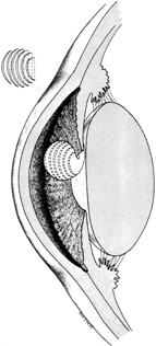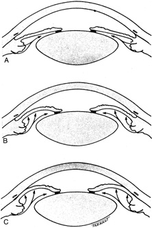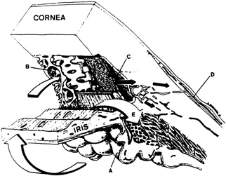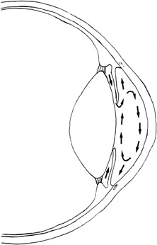 wastes such as CO2 and lactate.1,224 Ordinarily, there is little or no hindrance of the flow of aqueous through the pupil and thus the pressures in the posterior and anterior chambers are approximately equal, although the posterior chamber pressure must be slightly higher for flow to occur. Under certain circumstances, such as adhesions between the posterior surface of the iris and the anterior lens capsule (posterior synechiae) or the anterior surface of the iris and the corneal endothelium (anterior synechiae), or unusually tight juxtaposition of the pupillary iris and the anterior lens capsule, resistance to the flow of aqueous through the pupil (pupillary block) occurs (Fig. 11).457 If the resistance to flow is great enough, then the pressure in the posterior chamber increases relative to the anterior chamber. The pressure difference may be small, but even so may be sufficient to cause the peripheral iris to balloon forward. If the anterior chamber is at all shallow, as occurs by heredity in a small percentage of people, the peripheral iris may make contact with the trabecular meshwork, shutting off outflow of aqueous from the eye. The result is a rapid increase in IOP,458 as occurs clinically in acute congestive angle-closure glaucoma. Such a situation represents a medicosurgical emergency and must be treated rapidly with initial drug therapy (usually a combination of a miotic (pilocarpine), a β-blocker (timolol), a carbonic anhydrase inhibitor (acetazolamide), and a hyperosmotic agent (glycerine)), followed shortly afterward by iridectomy or laser iridotomy (the surgical formation of a hole [fistula] in the peripheral iris in order to allow unimpeded access of posterior chamber aqueous to the anterior chamber337) in order to save the retina and optic nerve from the damaging effects of the high IOP. Other causes of pupillary block include swelling of the lens or ciliary body, posterior direction of aqueous (ciliary block), choroidal or retinal tumor, retrolental fibroplasia, or persistence of hyperplastic primary vitreous. In the normal situation, once through the pupil and into the anterior chamber, the aqueous humor flows peripherally toward the anterior chamber angle where the drainage system lies. Superimposed on this peripherally directed and hydrostatically generated flow is the thermal circulation of the anterior chamber (Fig. 12), evidenced clinically in uveitis by the movement of cells in the anterior chamber upward near the warmer iris and lens and downward near the cooler cornea. Frequently, cells, pigment, and other debris may be deposited on the corneal endothelium in a spindle-shaped pattern reflecting the thermal current.1,457 By gonioscopy, the inferior trabecular meshwork may frequently be seen to contain more pigment and detritus than other areas of the meshwork, probably as a result of the effects of gravity.