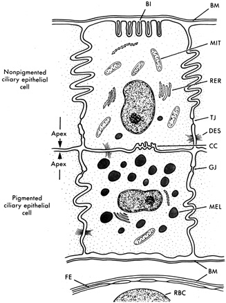 surfaces of the nonpigmented ciliary epithelial cells. Bill100,101 demonstrated that albumin and other proteins pass through the ciliary