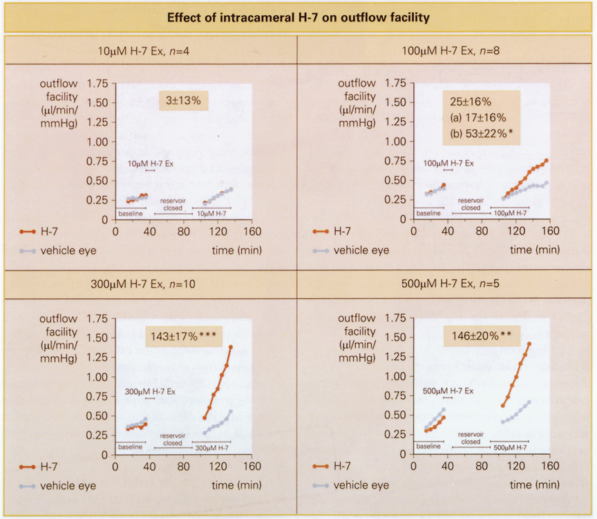 | Other agents that are known to affect trabecular outflow facility include α-chymotrypsin,623 ergotamine, angiotensin,641 chondroitinase ABC,642 and testicular643,644 or Streptomyces645 hyaluronidase. Pharmacologic trabeculocanulotomy utilizing agents such as the ones discussed (cytochalasins, chelators, ethacrynic acid, α-chymotrypsin, chondroitinase ABC, hyaluronic acid, H-7, and latruncluin A/B) has been proposed as a possible strategy for the treatment of glaucoma since the 1970s.646 The sequence of events by which these agents decrease outflow resistance is being clarified as described for H-7 and latrunculin A/B above. Another approach to increase aqueous humor outflow is to inhibit or enhance the molecular pathways involved in regulating trabecular cell contractility by using gene therapy647–650 or to block cellular interactions with the extracellular environment that enhance actomyosin contractility and the formation of actin stress fibers.651 Long-term expression of genes that alter aqueous outflow has not yet been possible in the nonhuman primate eye. Certain glucocorticoids administered topically or systemically to humans cause an elevation of IOP.337,652–654 Ocular hypertension can be induced in rabbits via the chronic systemic administration of glucocorticoids.655–657 The ability of glucocorticoids to alter IOP has been ascribed to their effect on the trabecular meshwork and aqueous humor outflow.658 Glucocorticoid receptors have been identified in the cells of the outflow pathways,659–661 but the biochemical and consequent physical processes causing the decrease in facility are poorly understood. Studies suggest that glucocorticoids may play a major role in the normal physiologic regulation of outflow facility and IOP, perhaps by modulation of macromolecular metabolism or prostaglandin/adrenergic interactions involving the outflow system. As mentioned earlier (aqueous secretion section), the aqueous humor of control and POAG patients has levels of cortisol in excess of what is in the general circulation as a result of the activity of 11β-hydroxysteroid dehydrogenase 1 in the ciliary epithelium where it is involved in regulating aqueous secretion.213,214 The cortisol levels could also reduce aqueous outflow facility to a level that is detrimental in susceptible individuals.218 In the normal population, 34% to 42% of patients treated with topical or systemic corticosteroids are termed steroid responders, and develop markedly elevated IOP after several weeks.653,662 A similar percentage of nonhuman primates also develop ocular hypertension after topical dexamethasone treatment.663 This contrasts to patients with POAG, 90% of whom are considered steroid responders.653,662,664 The oral administration of the glucocorticoid biosynthesis inhibitor metyrapone to patients with glaucoma665 or the 11β-hydroxysteroid dehydrogenase inhibitor carbenoxolone to ocular hyperpertensive patients214 elicit small, transient reductions in IOP. A generalized cellular hypersensitivity to glucocorticoids is not intrinsic to POAG.666 Patients with glaucoma have increased plasma levels of cortisol compared to normal individuals.667,668 The glucocorticoid effect on the physiology of the outflow pathways may be more rapid than previously believed—certainly less than the 3 to 6 weeks classically described after topical eye drops.669 In cultured trabecular meshwork cells obtained from patients with POAG, cortisol metabolism is altered. These cells accumulate 5β-dihydrocortisol and, to a lesser extent, 5α-dihydrocortisol, metabolites that are not found to be present in cells derived from normal individuals. This difference is due to a marked increase in Δ4-reductase activity and to a decrease in 3-oxidoreductase activity not found in all cortisol-metabolizing cells.670,671 Southren672 demonstrated that topically applied 3α, 5β-tetrahydrocortisol (3α, 5β-THF), an intermediate metabolite of cortisol, decreases IOP and increases outflow facility in glaucomatous human eyes, and that 3β, 5β-THF antagonizes dexamethasone-induced cytoskeletal reorganization in normal human cultured trabecular meshwork cells.672,673 Interestingly, cultured trabecular meshwork cells from patients with POAG metabolized cortisol predominantly to 5β-dihydrocortisol (5β-DHF), which potentiates the facility-decreasing and IOP-increasing effects of dexamethasone; these cells produce relatively little 3α, 5β-THF from cortisol.672 Possible mechanisms for steroid-induced elevation of IOP have been proposed and include: accumulation or deposition of extracellular matrix material,674–679 decreased protease and stromelysin activities,680,681 reorganization of the trabecular meshwork cytoskeleton,682,683 increased nuclear size and DNA content,684 decreased phagocytic capacity,685 and changes in the synthesis of specific proteins.686 The progressive induction of one major steroid product in human trabecular meshwork cells matches the time course of clinical steroid effects on IOP and outflow facility. This molecule, known as TIGR or myocilin (MYOC), appears to be a secreted glycoprotein with aggregation- and extracellular matrix–binding groups687,688 interacting with extracellular components such as fibronectin.544,689,690 MYOC has also been localized intracellularly in the trabecular meshwork.689,691,692 Initially MYOC has been linked directly to both juvenile- and adult-onset open-angle glaucoma.693,694 MYOC mRNA and protein are present in a variety of ocular and nonocular tissues.695 Mutations in TIGR/MYOC, however, are not implicated in causing or increasing susceptibility to steroid-induced glaucoma.663 It has been suggested that MYOC is a stress protein.696,697 MYOC has an antiadhesive effect on trabecular meshwork cells in culture resulting in a loss of actin stress fibers and focal adhesions. Counter migratory effects on trabecular meshwork cells are also observed.698 These properties could enhance cell lo
