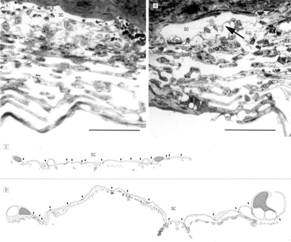 The uveal meshwork consists of small, round criss-crossing, interlocking, and branching bands (trabeculae) approximately 4 mm in diameter (Figs. 1 and 13), which tend to be radially oriented. The bands or chords consist of a single layer of endothelial cells surrounding a core of collagen. The spaces between the chords are irregular and range from 25 to 75 μm across. The chords are arranged in layers, or lamellae, but the layers are interconnected. Occasionally, some of the lamellae bridge across the ciliary body face in the angle recess to attach to the root of the iris and form an iris process.4,477,480 The trabeculae of the corneoscleral meshwork are more like broad, flat, endothelium-lined sheets, which tend to be progressively oriented in a circumferential pattern (Figs. 1 and 13). They are 3 to 20 μm in length, and are arranged in bands running around the angle. The spaces between the trabeculae are much smaller than in the uveal meshwork (10 to 30 μm) and are more elliptical. The spaces of adjacent lamellae are not behind one another but are offset, providing a rather convoluted passageway from internal to more external lamellae. Furthermore, as the lamellae approach Schlemm's canal, the spaces become 1 to 2 μm.481,482 The juxtacanalicular or endothelial meshwork, which separates the corneoscleral meshwork from Schlemm's canal is composed of a ground substance of connective tissue, incorporating glycoproteins and glycosaminoglycans. The trabecular meshwork forms the major site of resistance to aqueous outflow, that is, 60% to 80%.483 Removal of the trabecular meshwork from enucleated perfused human eyes results in a 75% or greater decrease in outflow resistance.270,484–490 The question of the exact site of resistance to aqueous humor outflow has significance for delineating the pathophysiology of POAG. Unfortunately, to date, the exact mechanism of aqueous humor outflow and site of resistance remain elusive. It is assumed that the aqueous easily percolates through the large spaces of the uveal meshwork and through the larger openings of the inner corneoscleral meshwork. The resistance to aqueous outflow is believed by most investigators to be located largely in the juxtacanalicular connective tissue, which has a covering of a single layer of endothelial cells on the side facing Schlemm's canal (the juxtacanalicular cells).491,492 Some investigators feel that the main resistance may lie slightly proximal to the juxtacanalicular tissue.493–495 Separation of the basal lamina cells lining of the inner wall of Schlemm's canal from the underlying juxtacanalicular tissue as seen using quick-freeze/deep-etch electron microscopy may represent flow pathways.496 Under normal conditions, the inner wall of Schlemm's canal and juxtacanalicular cells may be in a contracted state, limiting the routes available for fluid flow as demonstrated with gold particle infusion studies in nonhuman primates.497,498 Expansion of the area available for fluid drainage can increase the rate of fluid outflow.497,498 The accompanying loss of extracellular material may not be responsible for the decrease in resistance to fluid outflow.496–499 Aqueous humor enters Schlemm's canal inner wall endothelial cells via 1.5-μm passages.500,501 Vesicles and large vacuoles are frequently seen in the endothelium of the inner wall of Schlemm's canal (Fig. 14).491,501–504 The vacuoles may be as large as 5 by 14 μm. Their function is as yet unknown, but there is much speculation on the subject. Some have felt them to be an artifact, whereas others have suggested that these vacuoles serve a role in the exit, by bulk flow, of fluid and large molecules from the trabecular meshwork into the canal.505,506 Such vacuoles are also found in the arachnoid villi, and are involved in the drainage of cerebrospinal fluid.507 Tripathi508,509 postulated that these giant vacuoles alone serve as a transcellular pathway for aqueous flow across the inner wall of Schlemm's canal. Based on electron microscopic studies using ferritin as a tracer, Cole and Tripathi510 calculated that endothelial vacuoles constantly discharging their contents into Schlemm's canal have enough volume to account for the entire aqueous outflow. While this view is not universally held,511 these vacuoles undoubtedly provide a channel across which some aqueous and large particulate matter flow. This pathway has also been elegantly demonstrated by others,491 showing that red and white blood cells, as well as latex particles up to 1 μm in diameter, entered Schlemm's canal by way of the vacuoles (Fig. 15). Grierson and Lee512 showed that as pressure increased within the physiologic range, vacuolization of the endothelium of Schlemm's canal increased, but that pressures above the physiologic range produced actual occlusion of Schlemm's canal by distension of the corneoscleral meshwork and prolapse of the endothelium. Most giant vacuoles have short survival time once perfusion pressure decreases to zero, suggesting they can respond rapidly to IOP changes.513 Giant vacuoles may not be real intracellular vacuoles but rather dilatations of paracellular spaces.511 Pores of 0.8 to 1.8 μm were also present in nonvacuolated endothelial cells.491 Why endothelial cells should have tight junctions between them but pores within them is difficult to reconcile. Bill and Svedbergh514 have shown that the endothelial cells have a total of 20,000 pores with diameters of up to 3 μm, and that calculations based on this reveal that the pores could be responsible for all the bulk aqueous flow. Pores of the inner wall endothelium are thought to generate at most 10% of the resistance to aqueous humor outflow in humans. Pores of the inner wall cause a funneling effect in which aqueous humor flows preferentially through those regions of the juxtacanalicular tissue.515 However, the possibility that inner wall pores are fixation-induced artifacts cannot be excluded.516 Decreasing the tempera