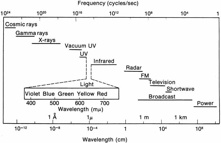 we see. Of course, a real objective difference does exist between a red and a green apple because color is determined in large part by the composition of light that enters the eye after being transmitted through or reflected off objects. However, many properties of the human eye and brain influence the color name that we give the object. Some of the physiologic processes of color perception are now understood in terms of the way light energy is transformed and coded into color signals and the way those signals are interpreted in the visual system. Not all humans see colors the same way. Most of us are resigned to occasional arguments about whether a carpet is beige or cream-colored. However, individual differences in color perception can be more profound and more important. Almost 10% of the male population and approximately 0.5% of the female population have defective color vision that makes it difficult for them to discriminate some colors—or at least more difficult than normal. This so-called color blindness is one of the most common of all genetic defects and has fascinated geneticists, vision scientists, and medical practitioners. Great advances have been made in understanding the genetics of normal and congenitally defective color vision. We now know the precise gene coding sequence for the rod and cone photopigments, and we understand more about variations in normal color vision and the underlying pigment changes that account for color vision defects. Very few people, perhaps 1 in 10,000, are truly color blind (that is, they see everything in shades of gray), but even the previously mentioned 10% of color-defective males and the 0.5% of color-defective females who do see color yet fail on tests of “color blindness” are likely to be precluded from engaging in certain occupations that require normal color vision (e.g., becoming policemen, firemen, pilots, or drivers). In this chapter, we present some of the results of physiologic and psychophysical studies made on encoding color vision signals in the visual system. Further, we relate these findings to the color discrimination of normals and color defectives in an attempt to understand why there are these differences between the two groups and discuss these differences in the context of clinical testing of color vision. The radiant energy that gives rise to the sensation of vision is a very narrow section of the electromagnetic spectrum (Fig. 1), with the wavelength of light being less than one ten-thousandth of a millimeter. The wavelength limits of visible light extend from the extreme violet end (wavelength approximately 400 nm or four ten-thousandths of a millimeter) to the extreme red part of the spectrum (wavelength 700 nm). Yet within this range, the human eye is able to distinguish many different color sensations.